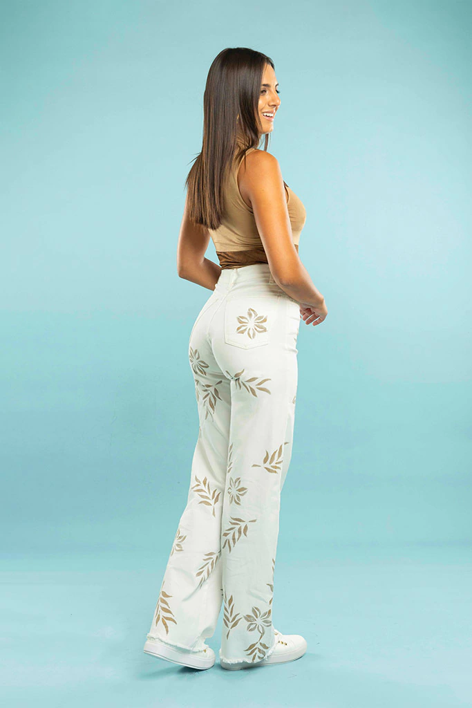 Wide leg rígido blanco tiro alto con estampa artesanal de hojas en tono dorado.
