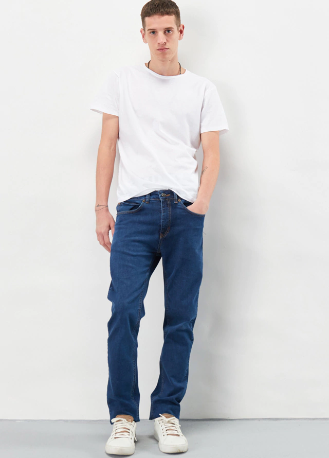 DESCRIPCIÓNEstos jeans azul oscuro de algodón elastizado están hechos de un denim súper suave y liviano para que puedas llevarlos todo el día sintiéndote cómodo con estilo. Realizados en corte slim fit, con costuras en color galletita logran darte el toque sofisticado que querés para tus conjuntos. Llevalos con un sweater escote V o cuello redondo.DETALLES- Slim fit- Costuras hilo color galletita- Pase central común- Cierra con botón metálico personalizado- Bolsillos delanteros con remaches personalizados y bocas desgastadas, relojero con boca desgastada y traseros con bocas desgastadas- Se ajusta chico al talle indicado- Tejido elastizado, ideal para todo el añoCOMPOSICIÓNComposición: 98% algodón y 2% LYCRA.