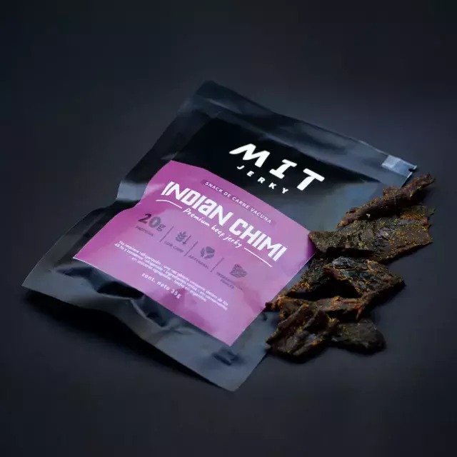 Jerky Chimichurri Indian Chimi 35gr - Mit JerkyDelicioso snack de carne vacuna deshidratada y marinada por 48 hrs.Alto en proteinas, bajo en calorias. Ideal dieta cetogénica.Práctico para consumir donde quieras. Disfrutalo en el trabajo, el gimnasio o en lugares extremoscomo la montaña.Versátil, para consumir como mas te guste. Comelo en el desayuno, combinalo con una ensalada o simplementdisfrutalo como un snack a cualquier hora del día.Presentación: 35 grs/ Envasado en atmósfera modificadaSabor: Chimichurri Indian ChimiContenido nutricional por paq: 122kcal/20 grs de poteínas /2,6 grs carbohidratos/3,5 grs de grasas