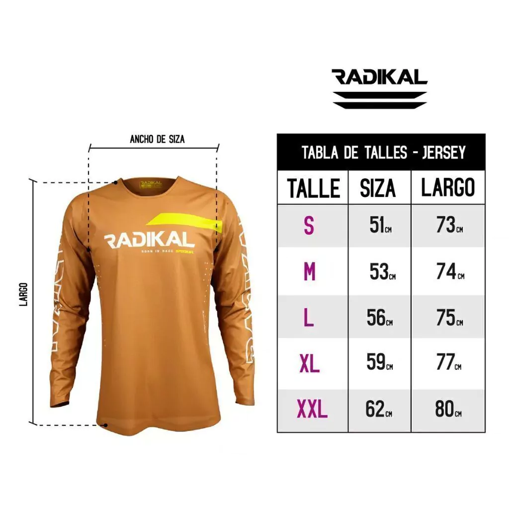 Jersey Downhill/Enduro Radikal Racing - Modelo Signature caquiJersey / Desarrollo Exclusivo Radikal Racing™.Material: Poliester liviano con sublimación de alta definición.Jersey combinado en Rojo y Negro.Línea: 2024