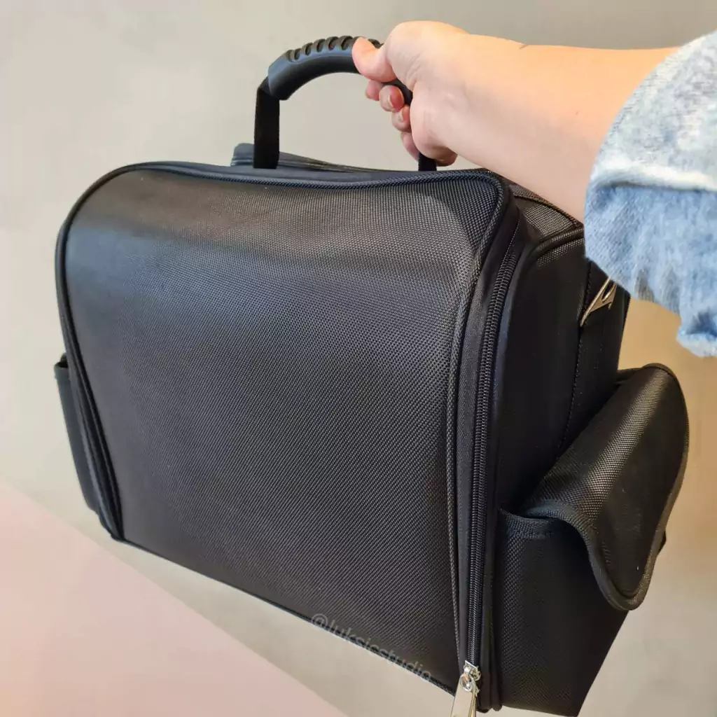 Maletín de tela Oxford con manija y correa para transportar. Con 4 portacosméticos y 2 bolsillos.