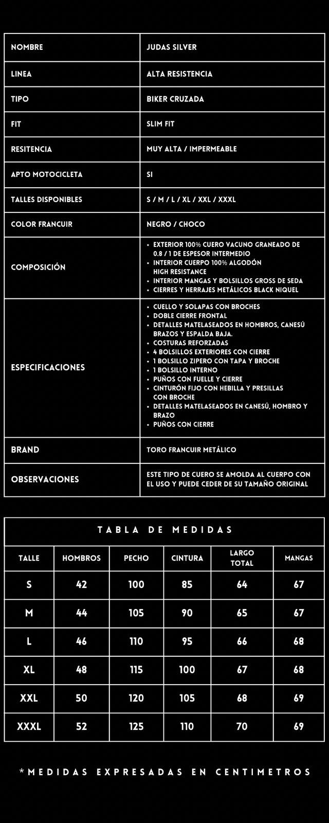 Judas Silver: campera cruzada biker, calce extra fit, confeccionada en cuero vacuno auténtico de grano completo, altamente resistente, impermeable y apta motocicleta.