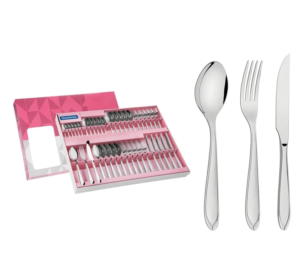 El juego de cubiertos con cuchillos para asado de acero inoxidable de 42 piezas de la línea Laguna cuenta con la calidad y buen gusto que solo Tramontina puede ofrecer. Con 42 piezas hechas totalmente de acero inoxidable, poseen características propias. Las cucharas, cuchillos y tenedores son diseñados para brindar más comodidad en su uso. Los cuchillos cuentan con la característica de templabilidad, garantizando mayor durabilidad al filo de corte y mayor resistencia a la corrosión. Además no arañan la porcelana. El juego de cubiertos viene con cuchillos especiales para el uso en asados. Son piezas versátiles que se pueden usar en cualquier ambiente y le dan un toque de buen gusto a su mesa, ya que cuentan con una terminación brillante y detalles en el mango. ¡Haga que su cocina sea aún más hermosa con estas piezas prácticas y llenas de estilo!