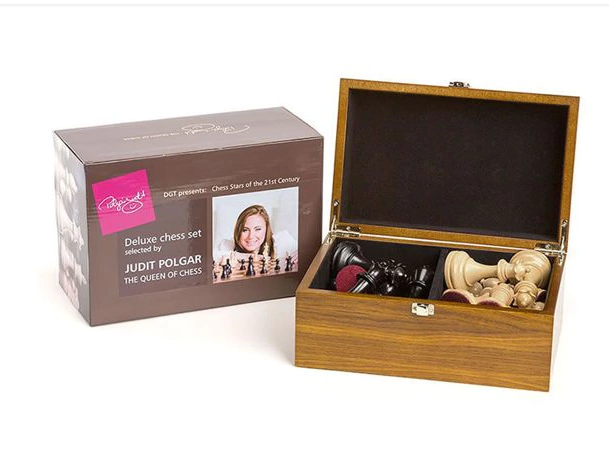Las hermosas piezas de madera y el magnífico tablero fueron seleccionados por Judit Polgar, la mejor ajedrecista del mundo. Las exclusivas piezas se entregan en una lujosa caja de madera con la firma de Judit. Cuentan con dos reinas de cada color. La altura del rey es de 95 mm (3,75").