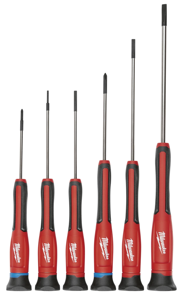 Juego de 6 Destornilladores de PrecisiónMarca: MILWAUKEECódigo 48-22-26062 Destornilladores Phillips: PH 00 x 50mm - PH 0 x 60mm4 Destornilladores Planos: 1,6mm x 60mm - 2mm x 60mm - 3,2mm x 90mm - 4mm x 100mmAlma de metalTapas con giro de 360°Incluye Estuche organizador