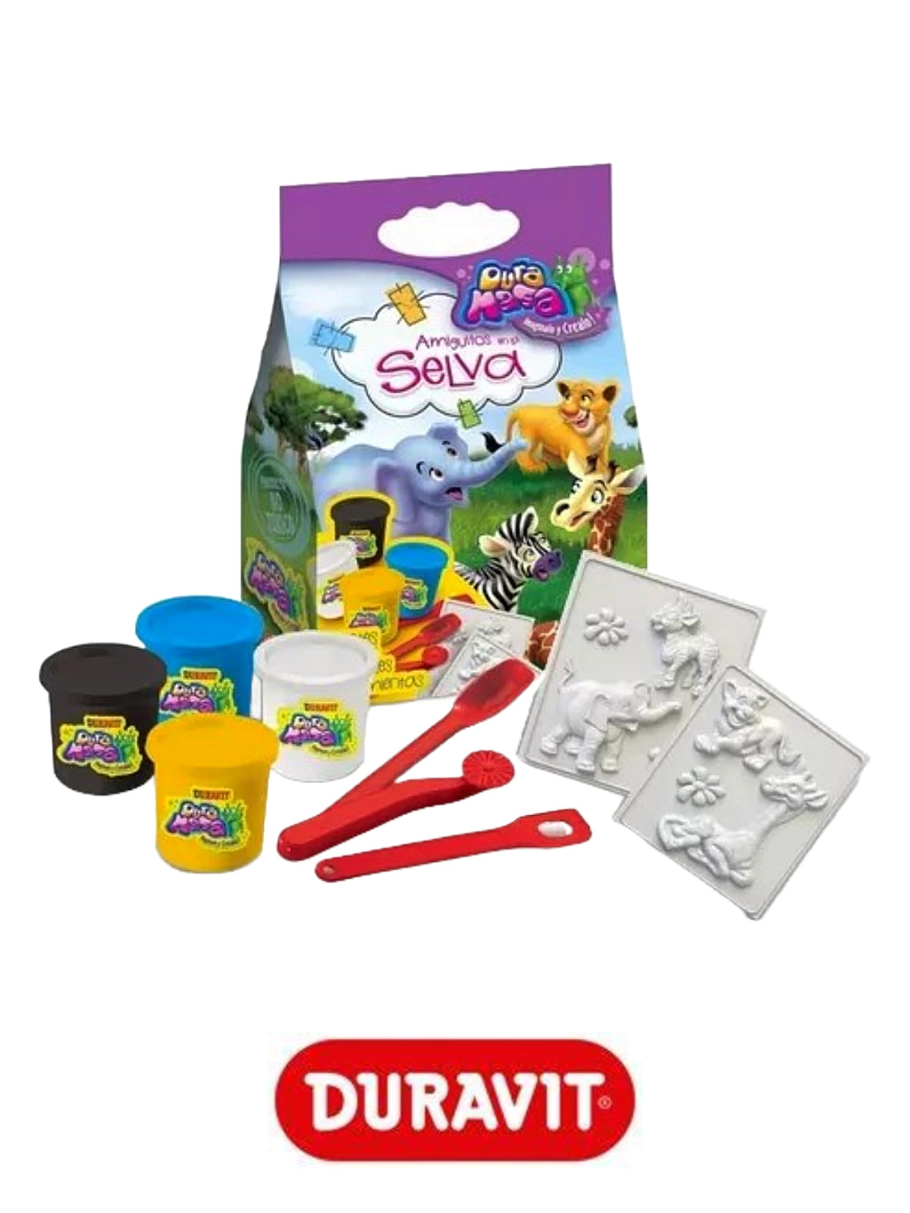 Animate a crear a los 4 amiguitos de la Selva, ellos se llaman Leo (leoncito), Dorita (jirafita), Trompita (elefantito) y Rayita (cebrita) les gusta jugar y reirse todo el dia!..Imaginate una historiaEstimula la creatividad, potencia la concentración, desarrolla la motricidad fina, facilita la expresión emocional, aprende a diferenciar colores y formas y fomenta el desarrollo de la personalidadIncluye:4 Potes de masas4 MoldesHerramientasEdad recomendada: +3 añosProducto no toxico
