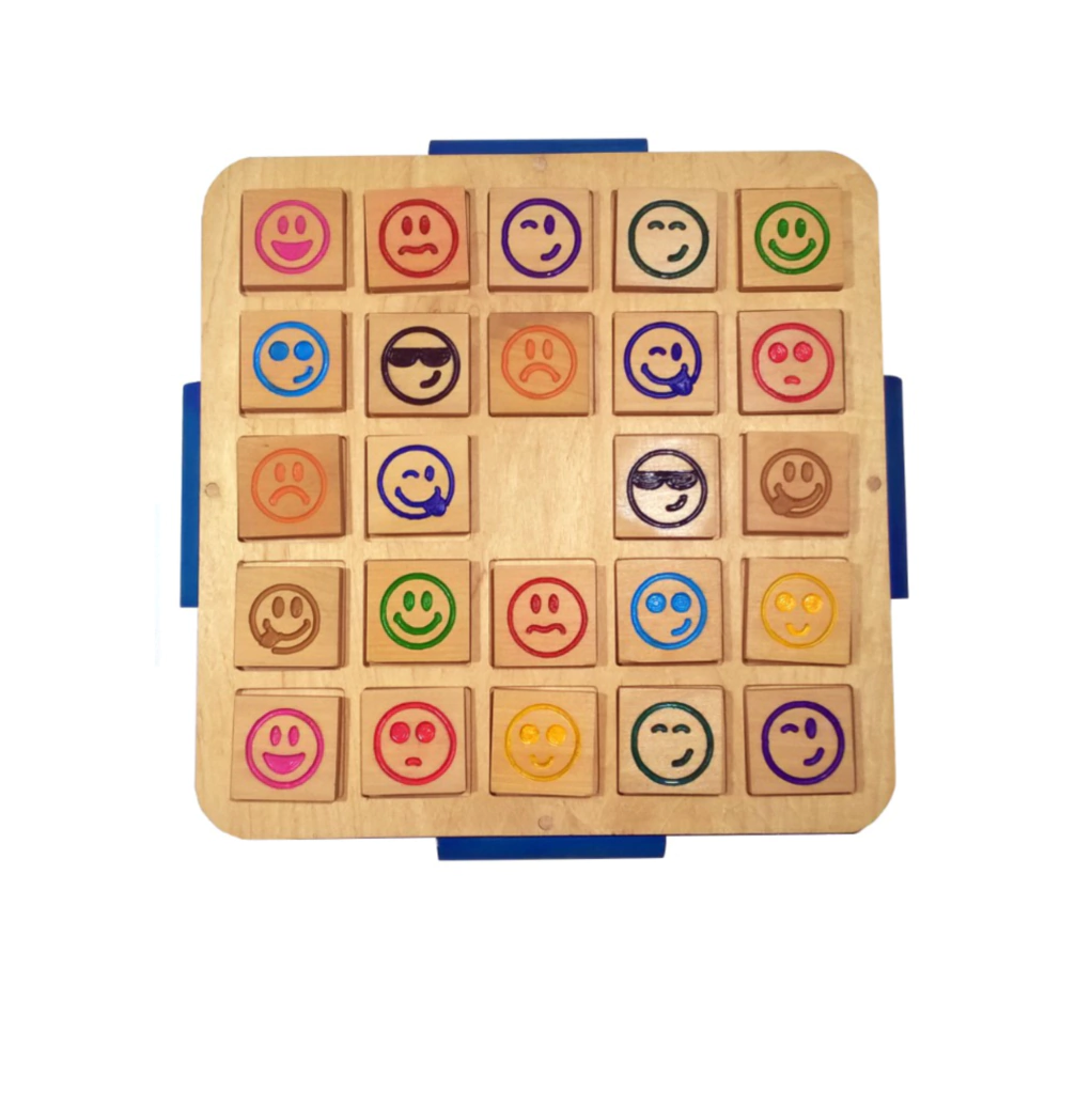 Características: 24 fichas con 12 colores y emoticones distintos sobre tablero de madera.