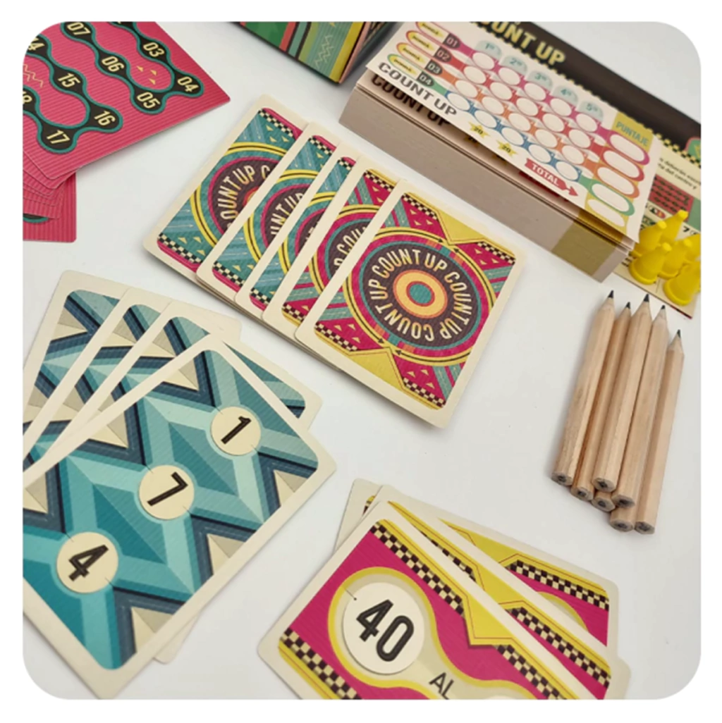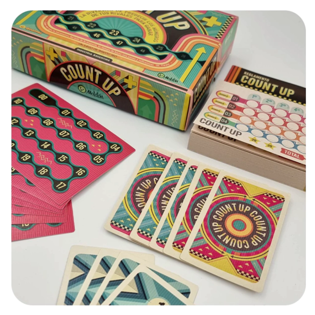 COUNT UPUn juego simple y entretenido donde tendrás que predecir qué números elegirán tus rivales y usarlo a tu favor, evitando usar los mismos para avanzar en el tablero, o repetirlo y ganar puntos extras.Cada jugador tiene un tablero, un papel de puntos y un peón.Se da vuelta una carta de restricción con números que no se podrán utilizar, por ejemplo 3 - 5 - 7. Todos escriben en sus papeles 5 números del 1 al 49 y no pueden terminar en los números de la carta de restricción, ejemplo 13, 25, 37...Empiezan a contar 1...2...3...4.. Cuando alguien escucha uno de sus números levanta la mano y dice MÍO...si nadie más anotó ese número, se apodera del conteo y continúa contando y va avanzando con su peón en su tablero personal, una casilla por cada número, hasta que alguien dice MÍO y ahí frena, ya que otro se apoderó del conteo.Si más de un jugador anotó el mismo número y se escuchan 2 o más MÍO...deben tachar cada uno ese número en su papel y seguir contando, SIN AVANZAR en el tablero. El punto extra que gana cada uno de ellos por tachar se encuentra en el borde superior del círculo tachado.Cuando se cuenta hasta el 49, se acaba la ronda, se cuentan los puntos extras por cada número tachado más el número que queda en el tablero según se haya avanzado. y se inicia una nueva ronda.Luego de 4 rondas, se suma el puntaje total y se obtiene un ganador. Si alguien logra sumar más de 20 puntos en 2 rondas, automáticamente se convierte en ganador.Jugadores: 3 a 7 jugadoresTiempo: 10 minutosEdad: 6 a 99 años
