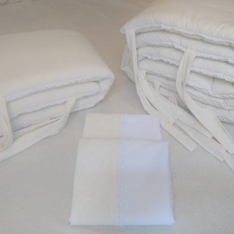 Juego completo de sábanas para cuna Charriot.Sabana ajustable en color blanco liso.Sábana superior con embozo en lienzo tusor liso100% algodón.Funda almohada blanca con embozo en lienzo tusor liso 100% algodón.Aplique de puntilla de algodón.Los tonos de embozo son los disponibles en stock, no se personalizan.