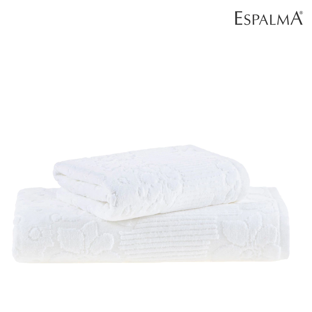 Juego de 1 toalla de cara y 1 toallón en jacquard de 100% algodón de 430 g/m2Prelavado y preencogidoTamaños:Toalla cara: 48 x 80 cmToallón: 70 x 135 cmColor: BlancoExclusividad EspalmaGarantía de absorción y durabilidadCuidadosLavar antes de usar.Lavar a máquina a temperatura máxima de 60°C.Lavar colores oscuros por separado.No dejar en remojo.No limpiar a seco.No usar lavandina.Usar suavizante con moderación, en exceso reduce la capacidad de absorción.Puede secar en secarropas a baja temperatura.Puede planchar a temperatura máxima de 110°C.