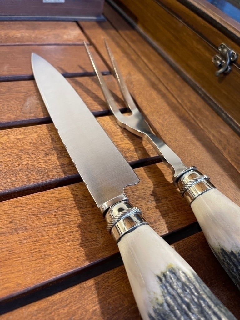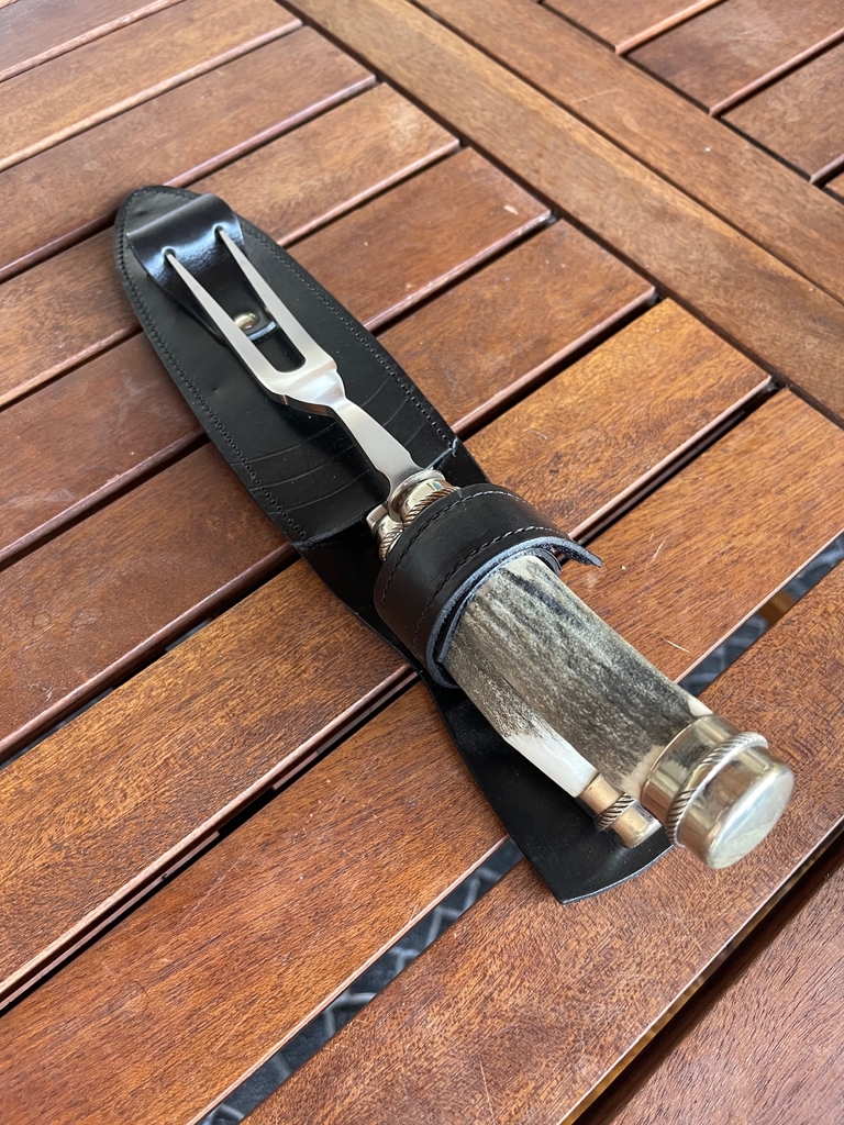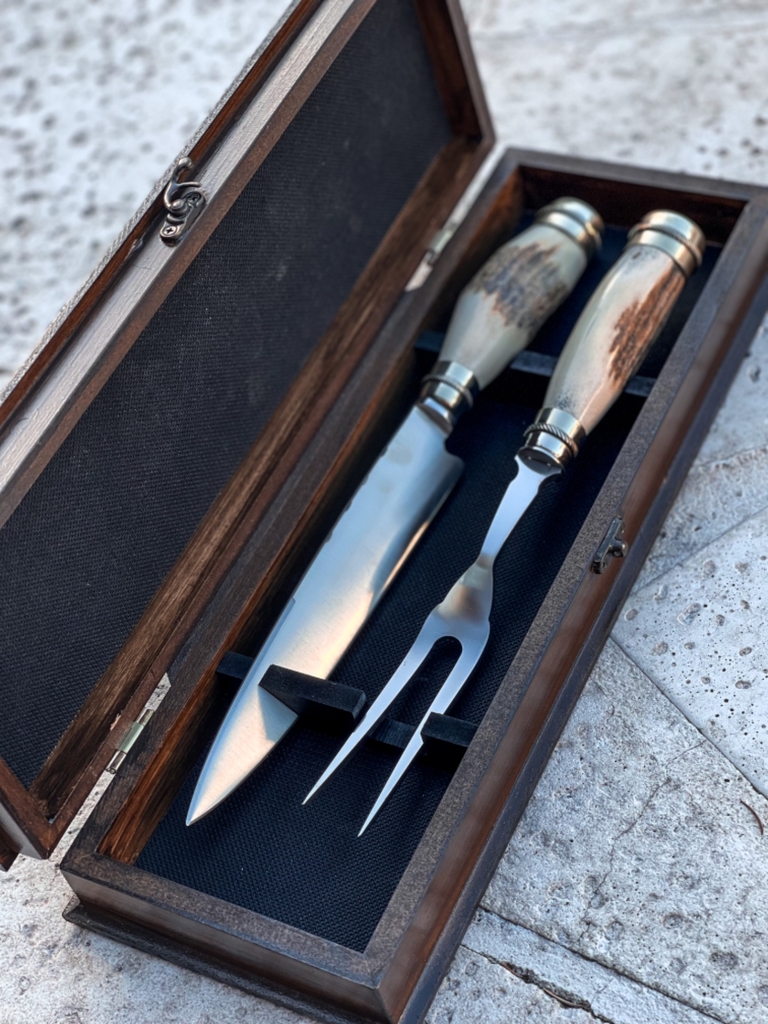 ? Increible Juego de Trinchar ?o Cabo de ciervo con copas de alpaca.o 18 cm de hoja acero inox 420.o Incluye caja de madera con paño.Ideal para regalar o regalarte en cualquier ocacion.Envio gratis a todo argentina.Somos ParrillasArg.
