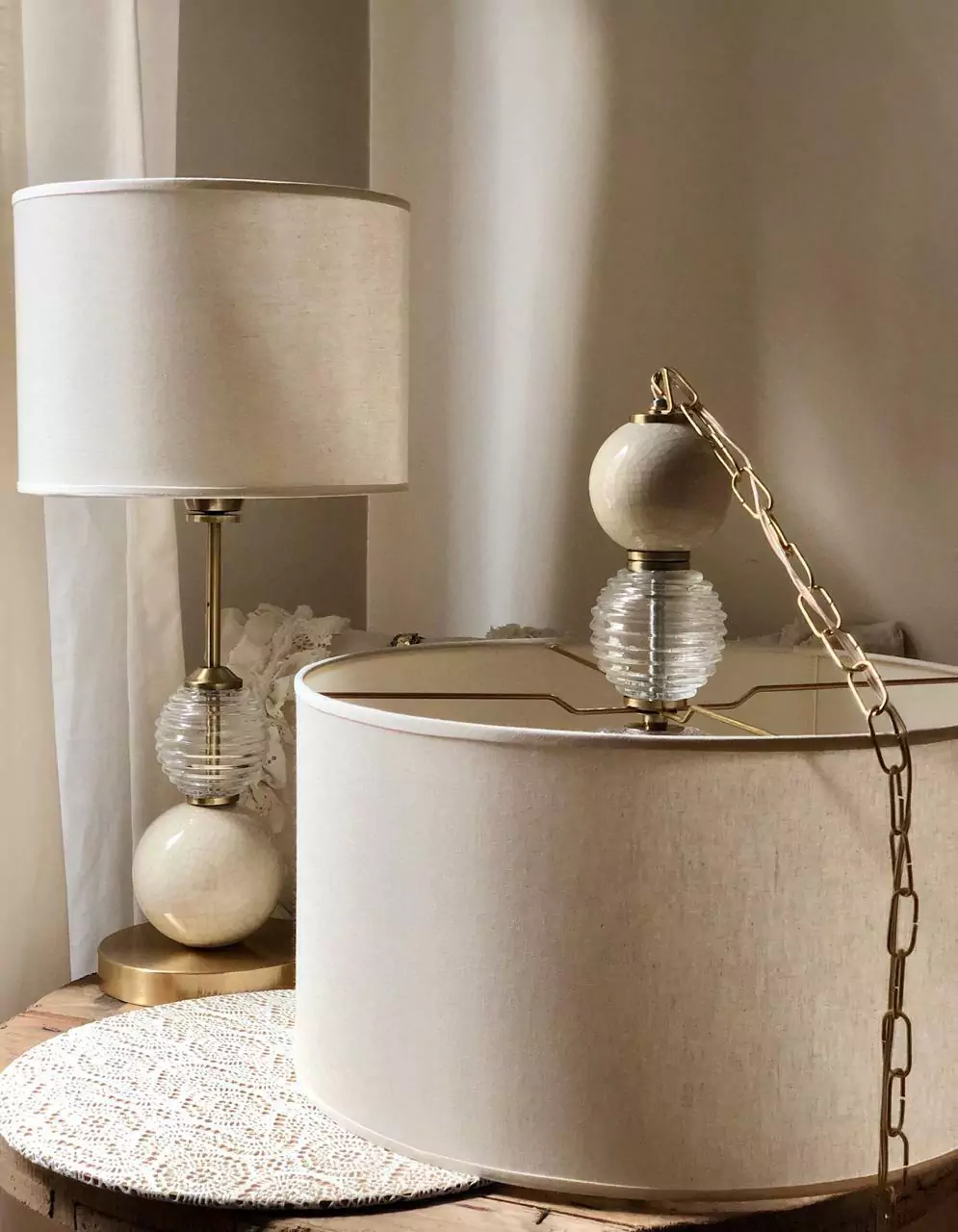 Lámpara de Techo Singapur con pantalla a elección (lino blanco/ lino natural/ arpillera tradicional/ arpillera crema) de 40 cm de diametro; cerámica esmaltada (color a elección) con un metro de cadena (metal plata/oro/cobre/florentino (oro envejecido)).Lámpara de mesa Julie 50 cm total con pantalla; color de metal a elección (plata/oro/cobre/florentino (oro envejecido)); cerámica esmaltada (color a elección); accesorio en cristal tallado y pantalla a elección (lino blanco/ lino natural/ arpillera tradicional/ arpillera crema).
