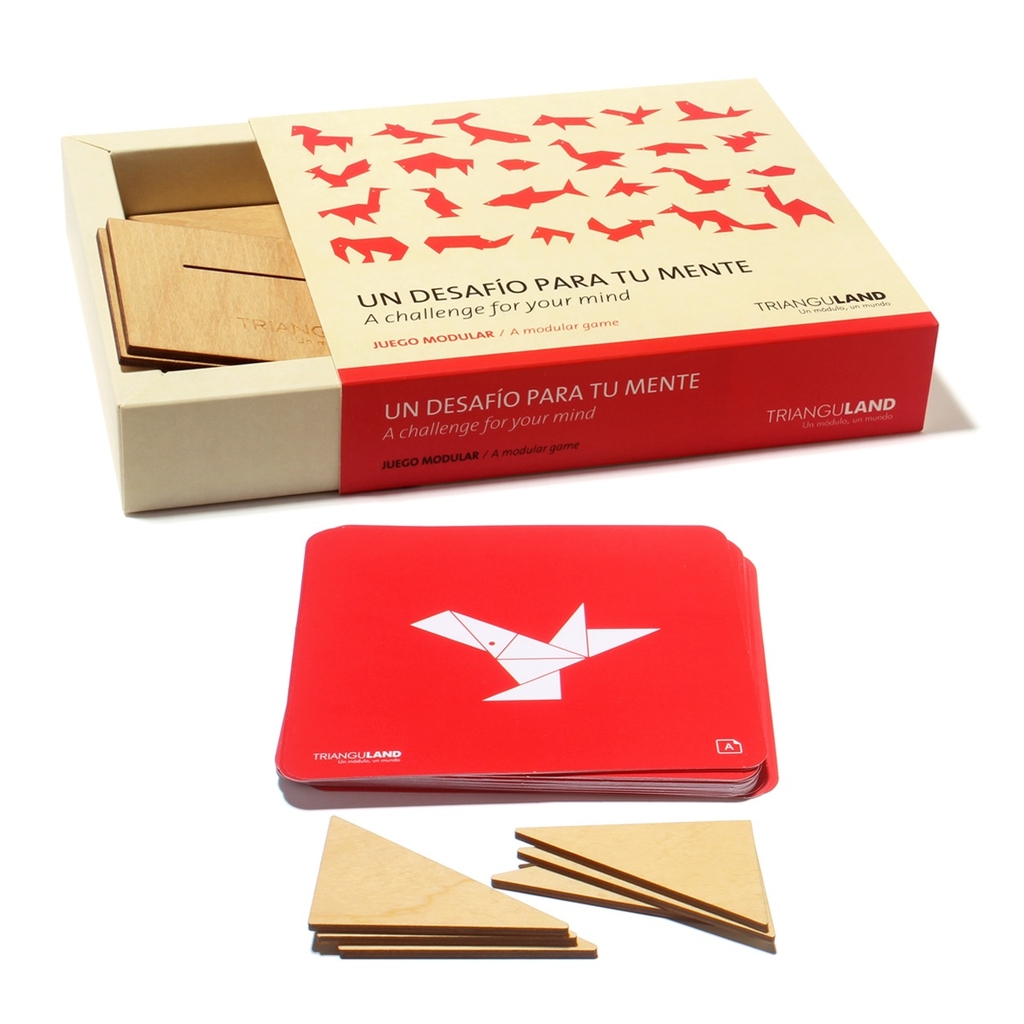 24 tarjetas de figuras + 2 tarjetas de instrucciones 2 atriles de madera 36 módulos triangulares de madera