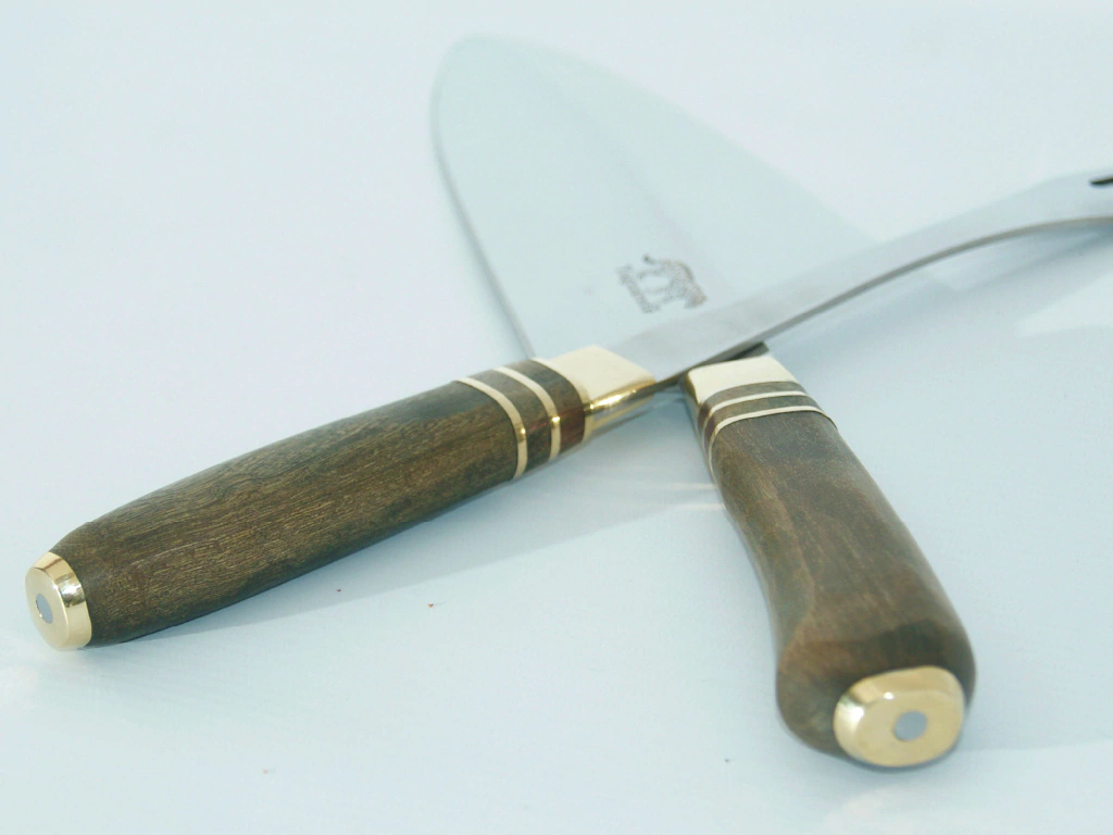 Juego parrillero de Cuchilla y Tenedor Artesanal de acero inoxidable, encabado con una técnica embutido que combina madera de guayubirá y bronce, y vaina de cuero.Medidas:Cuchilla TenedorLargo 37 cm 32cmhoja 23 cm 19 cmMango 14cm 13 cmEspesor 2 mmEste juego parrillero está fabricado con acero inoxidable, calidad 420, de 2mm de espesor. Ideal para disfrutar de asados en familia y amigos.Este juego parrillero fue encabado con una técnica de enchufe combinando bronce y madera de Guayubira, la cual se caracteriza por ser dura y resistente pero fácil de trabajar. Sus vetas profundas y de diversos tonos hacen que los modelos de Cuchillería Yaguareté se distingan dándoles un toque único.Cuchillería Yaguareté es un taller artesanal, por lo que sus productos son totalmente confeccionados a mano. Por tal motivo, las irregularidades que puedan presentar forman parte de su distinción y muestran una gran dedicación del artesano.Los milímetros de acero anunciados en este producto corresponden al espesor del acero con el que está fabricado el modelo en cuestión. Debido al desbaste que sufre la pieza de acero en el proceso de fabricación este espesor puede disminuir ente 0,5mm y 0,6mm.
