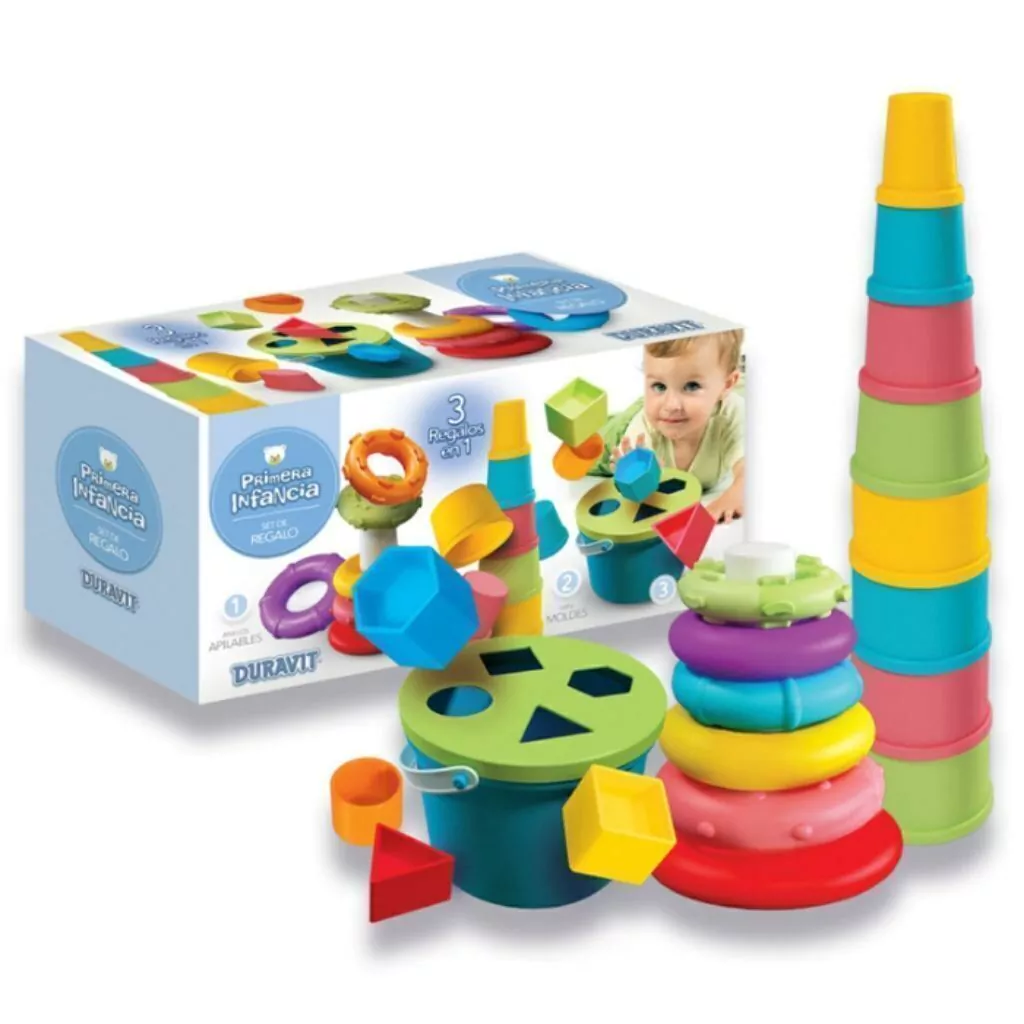 Para la primera infancia ya que nuestros niños necesitan jugutes seguros para desarrollar su habilidades de manera natural y expontáneaEl juego está compuesto por un aplilable de aros, un balde con formas y moldecitos apilables