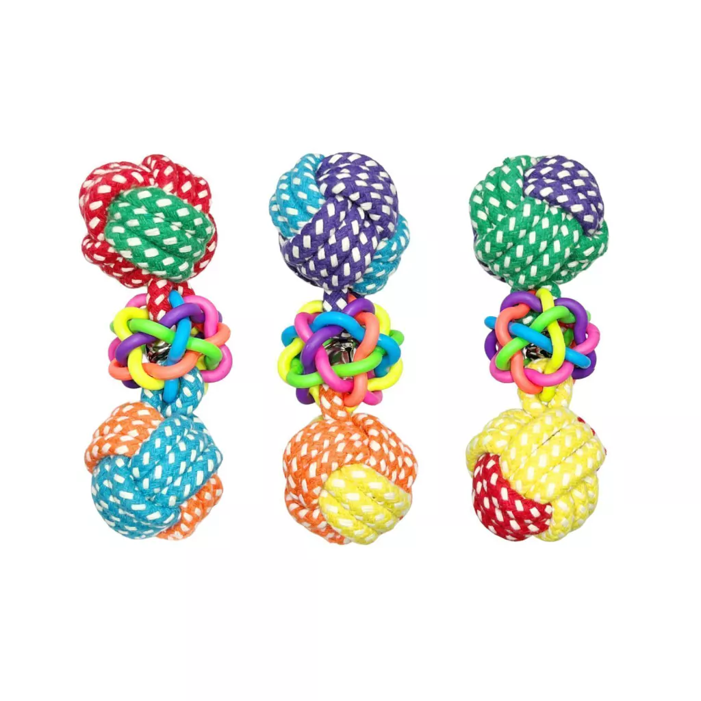 CaracterísticasDivertida pelota construida con soga de algodón trenzado y silicona con un cascabel en su interior.Resistente, va a entretener a tu mascota, por largos periodos de tiempo, calmando el stress y la ansiedad, sobre todo en aquellos animales que tienen periodos de soledad extensos.Tamaño 19cm x 7 cm
