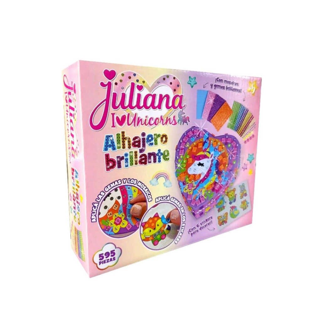 Las imágenes y colores son ilustrativos y pueden variar, asegurando una sorpresa única en cada paquete. Con el Juliana Alhajero Unicornio, cada niña puede crear su joyero lleno de brillo y unicornios, haciendo que sus tesoros sean tan especiales como ella misma. ¡Regala un mundo de fantasía y diversión!