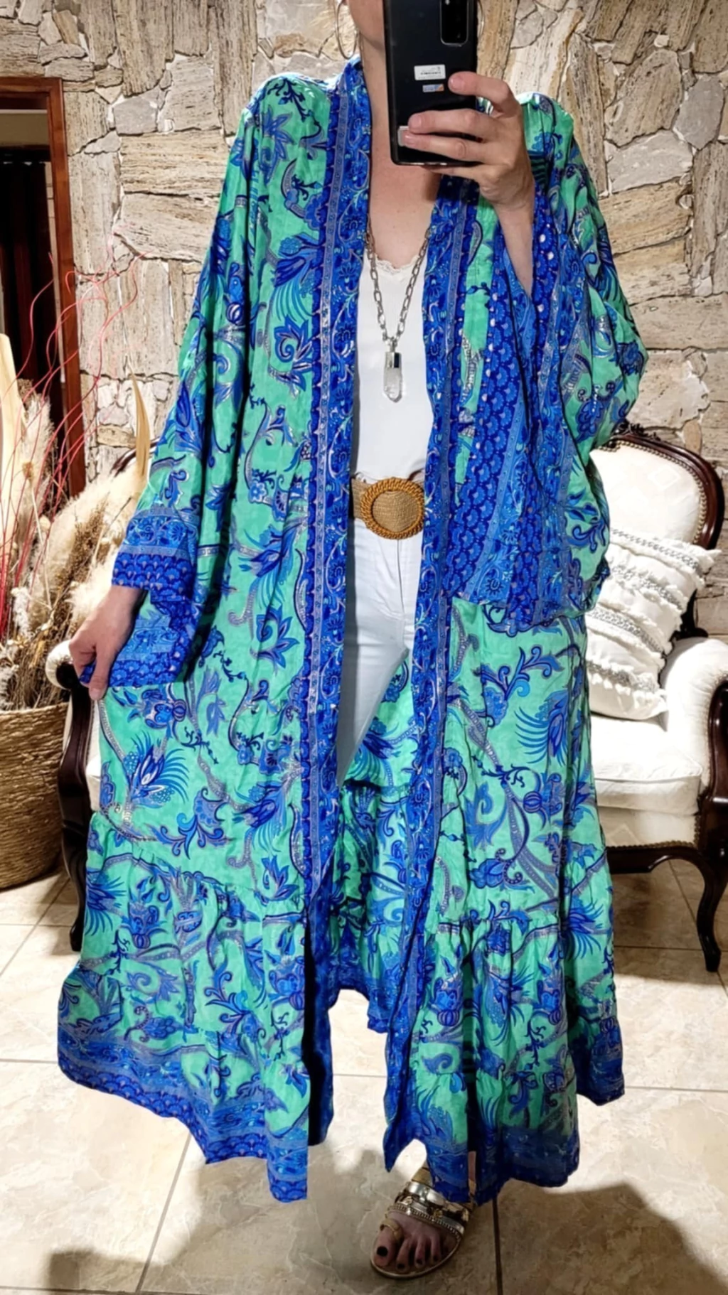 Kimono AMPLIO línea importada, confeccionado en seda estampada premium. Mangas caídas en pico y faldón con recortes fruncidos que forman capas de volados planos, discretos y finos.Trae lazo para uso opcional. Es un ARTE.. Talle único AMPLIO, que se adapta hasta un 4XL, aprox. Ver medidas que dejamos a continuación y comparalas con las de tu cuerpo.