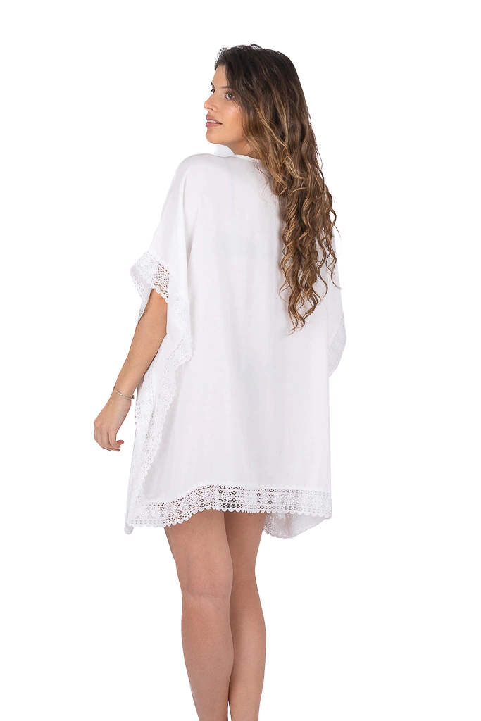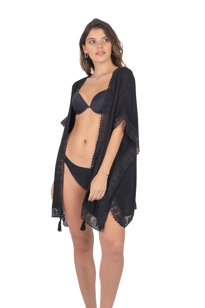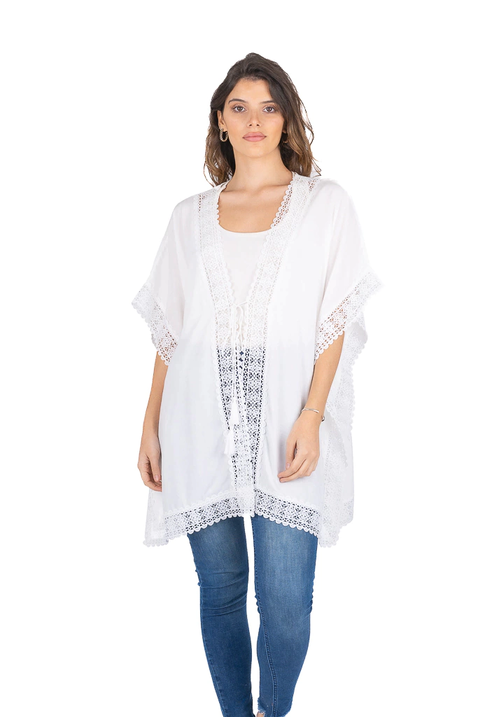 Kimono con detalles broderieTalle UnicoAncho:90cmLargo cada lado: 80cmBusto:90cmLAS MEDIDAS SON APROXIMADAS Y TOMADAS EN UNA SUPERFICIE PLANAComposicion: 100% ViscosaCuidados de las prendasNo lavar con agua caliente, lavar con agua fria y A MANONo centrifugar ni secar en maquinaSecar en la sombraNo retorcer ni estrujar