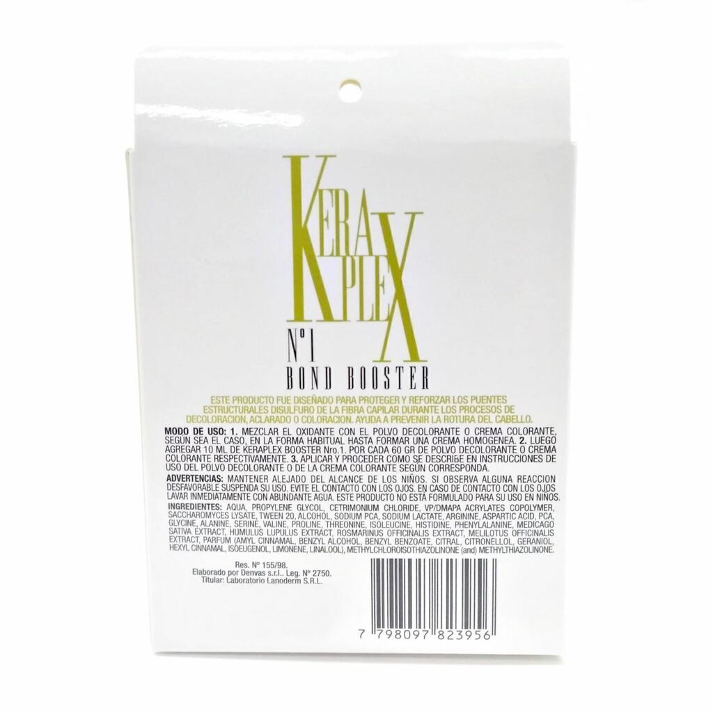 KIT X 4 SOBRES BOND BOOSTER PASO N° 1 KERAPLEX BELLISSIMA X 10 ML CADA UNOProtege y refuerza los puentes de la fibra capilar, evita la rotura del cabello.Previene el daño durante y después del proceso de decoloración.- Modo de uso:Mezclar el oxidante con el polvo decorante de manera habitual hasta formar una crema homogénea.Agregar un sobre de Keraplex cada 60 gramos de polvo decolorante y volver a mezclar.PRODUCTO VEGANONO TESTEADO EN ANIMALES / LIBRE DE CRUELDADLIBRE DE PARABENOS Y SALES