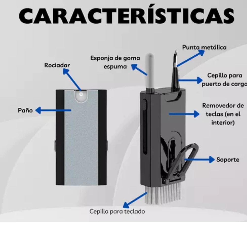 Kit 8 en 1¡Explora un mundo de limpieza y mantenimiento impecable con nuestro Kit 8 en 1! Diseñado con la durabilidad en mente, este completo kit es la solución definitiva para cuidar tus valiosos dispositivos electrónicos. Equipado con una asombrosa variedad de 8 herramientas especializadas, este conjunto te brinda todo lo que necesitas para mantener en perfecto estado tus cámaras fotográficas, teléfonos móviles, computadoras, teclados, auriculares y puertos de carga.El Kit 8 en 1 es el complemento perfecto para tus dispositivos electrónicos. Ya sea que seas un usuario casual o un profesional que necesita mantener sus dispositivos en óptimas condiciones, este kit es para ti.No pierdas la oportunidad de tener todos los elementos que necesitas para limpiar tus dispositivos electrónicos en un solo kit.Funciones enumeradas:1: Paño de microfibra para limpiar pantallas (se engancha con velcro)2: Cepillo para limpiar teclados, PC y sacar el polvo de pantallas3: Micro-cepillo para sacar el polvo de los auriculares4: Punta metálica para quitar residuos y cera de tus auriculares5: Herramienta de forma alargada y acolchonada para limpiar la caja de los auriculares6: Soporte para apoyar el celular y mirar videos sin tener que sostenerlo7: Spray rociador de líquido para limpiar pantallas y eliminar manchas8: Herramienta para remover teclas de los teclados mecánicos y poder limpiar debajoLargo de las cerdas del cepillo: 2cmEste kit no solo te permite mantener tus dispositivos en estado impecable, sino que también te brinda la satisfacción de que tus productos perduren en el tiempo. Con el Kit 8 en 1, cada detalle de limpieza está al alcance de tu mano, garantizando que tus dispositivos electrónicos siempre luzcan y funcionen como nuevos.¡Eleva tus estándares de cuidado electrónico con este kit excepcional!