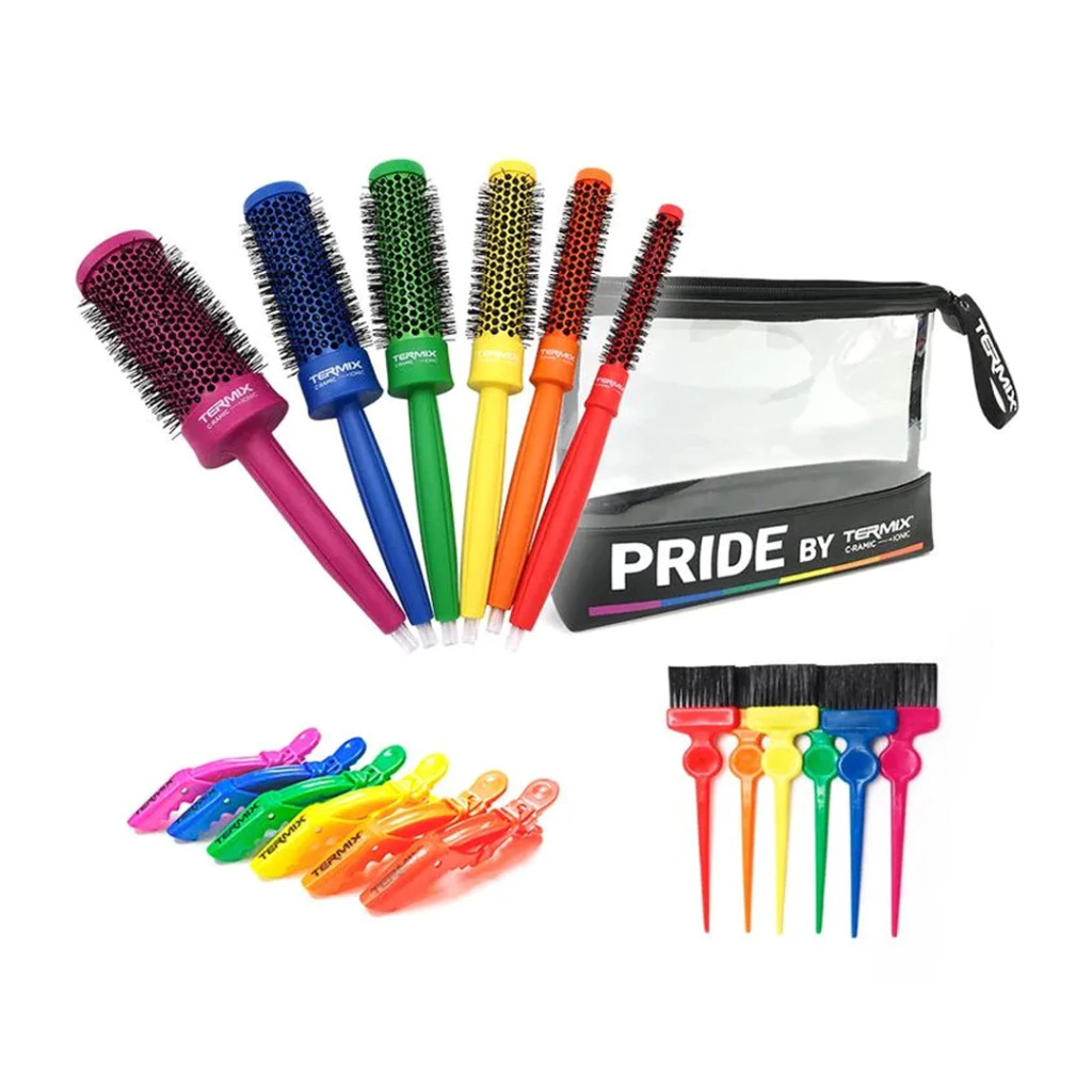 El nuevo pack C·Ramic Pride apuesta por marcar la diferencia. Incluye 6 cepillos térmicos de distintos colores y diámetros diseñados con la última tecnología que se adaptan a cada tipo de cabello.Para que puedas crear estilos sin límites, dando rienda suelta a la creatividad siendo la apuesta perfecta para aquellos profesionales que se atrevan a mostrar todo su potencial.Tecnología iónica: Las fibras de nylon de los cepillos incluyen tecnología iónica que eliminan el encrespamiento para un peinado mucho más duradero.Recubrimiento cerámico: El tubo de los cepillos está recubierto en su totalidad por cerámica. Esto permite que la temperatura se reparta de forma homogénea a lo largo de toda su superficie para que el calor incida de forma indirecta en el cabello.Potencia el brillo del cabello: Además la cerámica colabora a potenciar el efecto refractante del cabello, por lo que se traduce en un cabello mucho más brillante.Pack de 6 cepillos: El conjunto incluye los 6 diámetros más demandados: 12, 17, 23, 28, 32 y 43 mm para que puedas crear los estilos que quieras adaptándote a todo tipo de corte de cabello.Colores más intensos: Rojo, naranja, amarillo, verde, azul y violeta.Incluye también picos y pinceles para tintura.