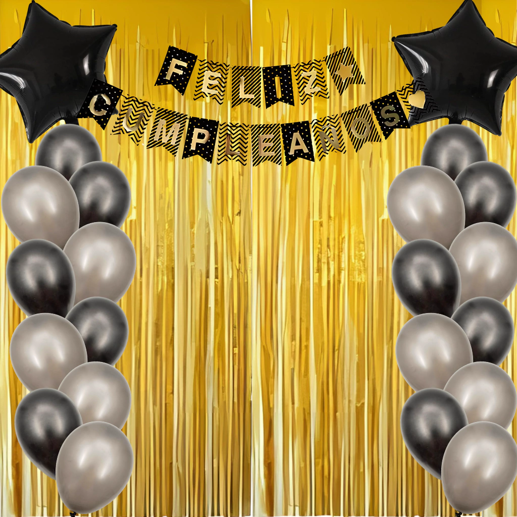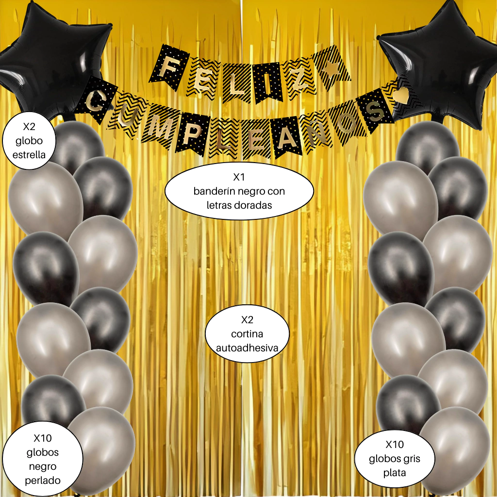 ¡Perfecto kit para festejar tu cumpleaños!Contiene:- 1 banderin negro "Feliz cumpleaños" cn letras doradas- 2 globos estrella metalizado negro de 18"- 10 globos gris plata de 12"- 10 globos negro de 12"- 2 cortinas de flecos doradas metalizadas auto-adhesivas de 1m X 2m