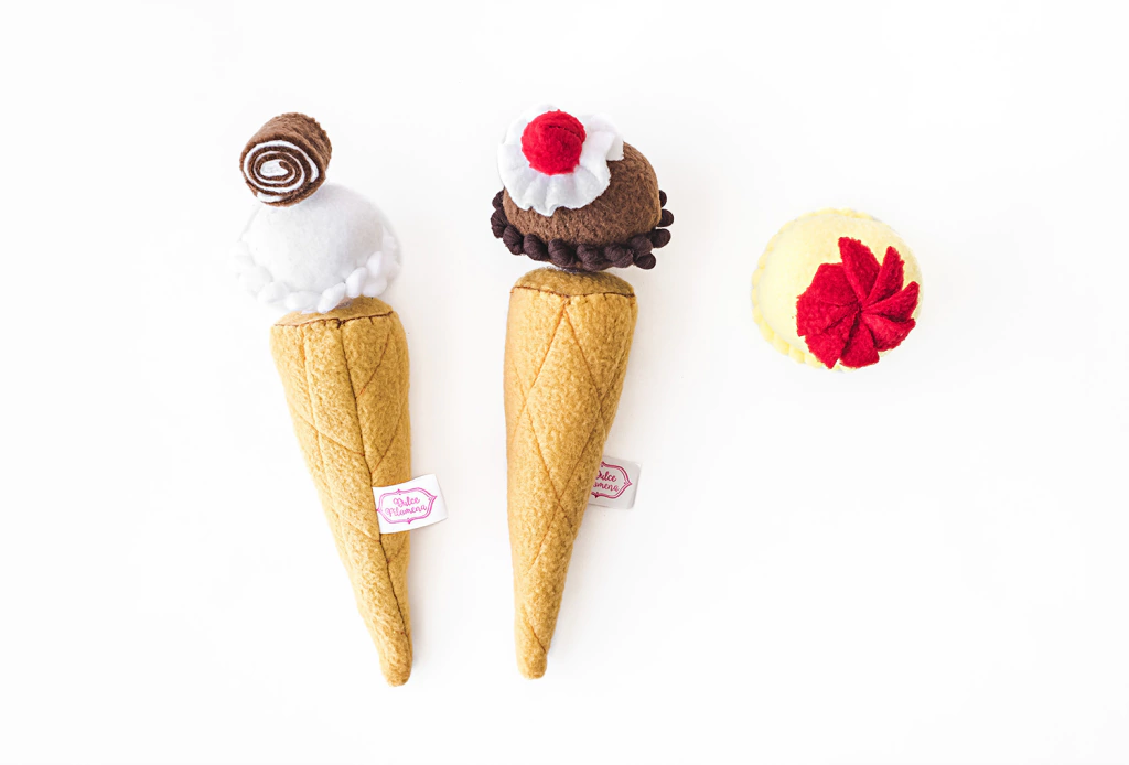 Kit de helados estan confeccionados en tela polar,kit contiene:3 bochas3 topping, para que puedan armar con los gustos que más te guste con el topping que quieras.Son fáciles de lavar, tienen abrojo y son maleables.Se entregan en bolsa de friselina con ventana de nylon cristal asi es fácil de guardar una vez que termina el juego.