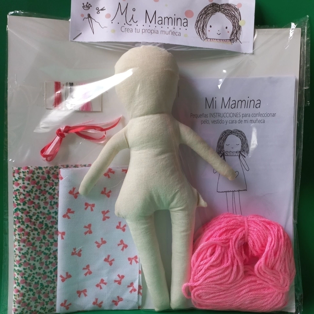 Hermoso kit para diseñar y personalizar una muñeca de trapo.