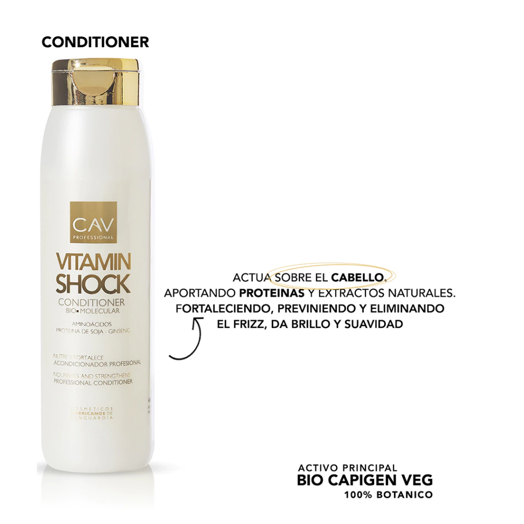 Modo de uso: Lava tu cabello dos veces con el Shampoo Vitamin Shock, dejando actuar el segundo lavado durante 5 minutos. Luego, enjuaga y aplica el Conditioner Vitamin Shock, dejándolo actuar por otros 5 minutos. Finalmente, enjuaga, peina y seca tu cabello como de costumbre.