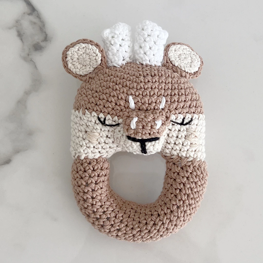 Acompañado del indiscutible SONAJERO, genera estimulación sensorial. El sonido suave que produce al moverse y la textura del crochet estimulan los sentidos del bebé, fomentando su desarrollo autidivo y táctil.