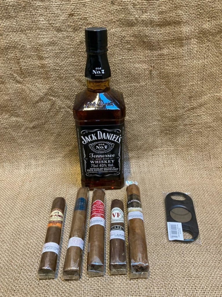 Producto: Kit/Combo Whisky + Cigarros + Accesorios. Todo presentado en hermosa caja regalo/obsequio decorado con viruta de madera. Ideal para regalo fiestas, cumpleaños, regalo empresarial, etc.El kit incluye:- Whisky Jack Daniels No 7. 750cc. Origen U.S.A. (Tennessee).- 1 caja de Bombones Ferrero Rocher que contiene 3 unidades.(aclaracion es blister de 3unid, no 4).- 1 Cigarro Te amo. Origen Mexico- 1 Cigarro Francisco de Miranda. Origen Rep. Dominicana.- 1 Cigarro A. turrent. Origen Mexico- 1 Cigarro Vegafina. Origen Rep. Dominicana- 1 Cigarro Placeres Reserva. Origen Honduras- 1 Corta Cigarro Cepo 60. Doble hoja acero.Acerca del Whisky:FICHA TÉCNICAEl color, cuerpo y sabor característico del Jack Daniels se debe a un minucioso proceso que lo hace único. El whisky se realiza con agua subterránea sacada de una cueva en Tennessee, además al whisky se lo somete a un proceso llamado charcoal mellowing que consiste en filtrarlo a través de carbón de arce sacarino que lo convierte en lo que es: un Tennessee Whisky y no en un Bourbon, licor con el que se lo confunde por su suavidad a pesar de su alta graduación alcohólica. Finalmente el whisky es añejado en barriles de roble blanco que son ensamblados a mano y quemados por dentro para fundir los azucares propios de la madera y darle al Jack Daniels su sabor y color ámbar.Tipo: BourbonCorte: Tennessee WhiskyAlcohol: 40%Lugar de Elaboración: Tennessee. Estados Unidos.