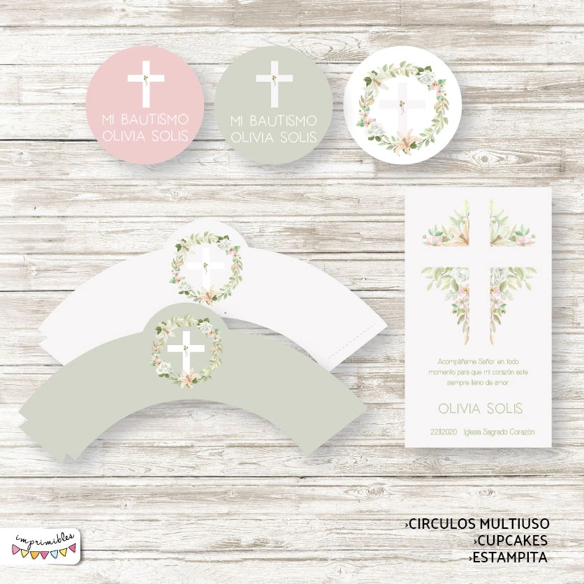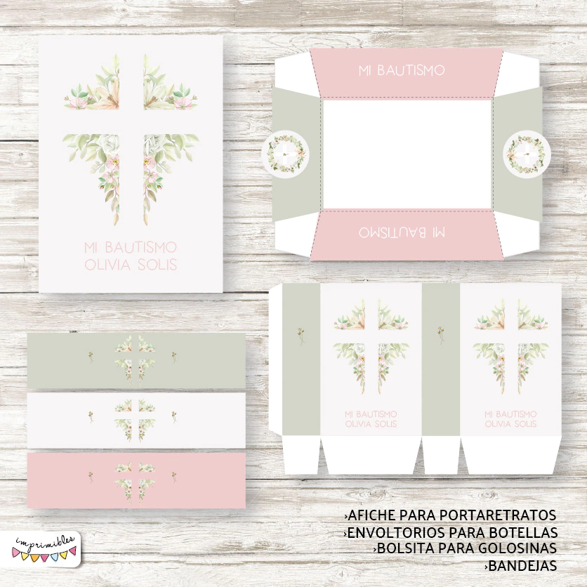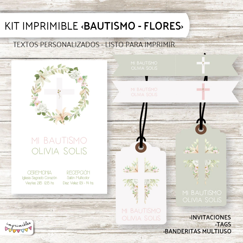 Kit imprimible Bautismo con floresTextos personalizados - Listo para imprimir.No se envian archivos editables.¡Te ofrecemos un Kit personalizado para que puedas imprimir en tu casa todo lo que necesitás para armar una fiesta inolvidable!El Kit incluye:~Invitaciones (Incluye archivo para mandar por WhatsApp)~Estampita~Banderin con nombre~Banderitas multiuso~Poster para portaretrato 15 x 21 cm.~Círculos multiuso de 6 cm.~Cupcakes~Tarjeta de mesa o multiuso~Etiqueta cierrabolsa~Tarjeta de agradecimiento~Bolsita golosinera~Tiras multiuso de 20 x 5 cm.~Bandeja 10 x 15 cm.------------------------------------------------------------------Antes de comprar te recomendamos leer lasPREGUNTAS FRECUENTESpara despejar tus dudas y evitar reclamos posteriores.-El kit se envía dentro de las 48 horas de recibidos los datos para editarlo.-Está completamente prohibida la REVENTA o INTERCAMBIOde los kits de Imprimibles en plataformas de venta online o en redes sociales, sea este con o sin fines de lucro.