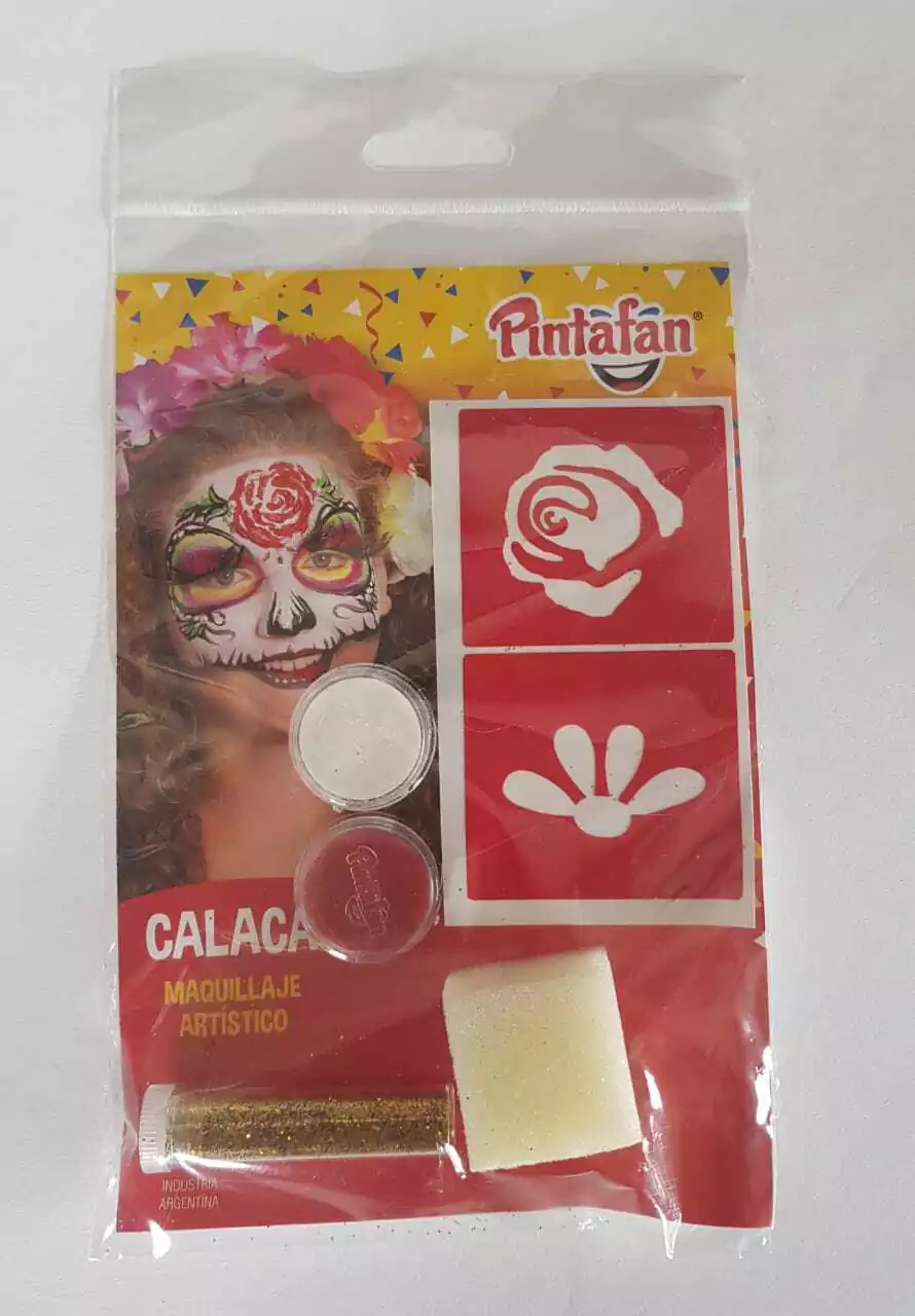 Kit Maquillaje Infantil Calaca HalloweenMarca PintafanIncluye:2 pastillas acuarelables rojo y blanco.1 esponja.1 glitter polvo dorado.1 stencil.con Instrucciones de uso.