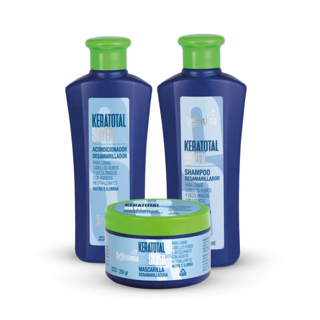 Shampoo Keratotal Silver x 270 mlAcondicionador Keratotal Silver x 270 mlMáscara Keratotal Silver x 250 mlTratamiento desamarillador matizador para cabellos rubios, canosos y decolorados. Los agentes neutralizantes eliminan los reflejos amarillos. Nutre e ilumina la fibra capilar, permite lucir un cabello radiante y con estilo. Acción progresiva.