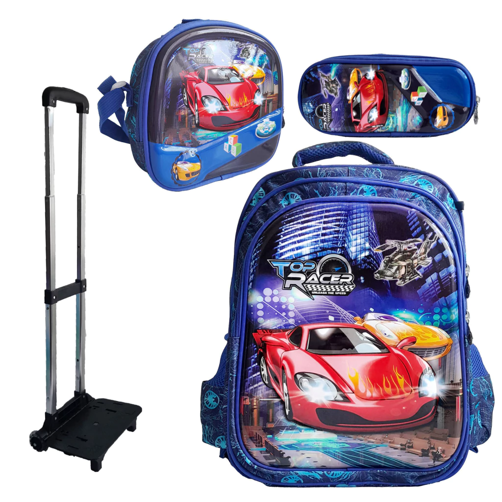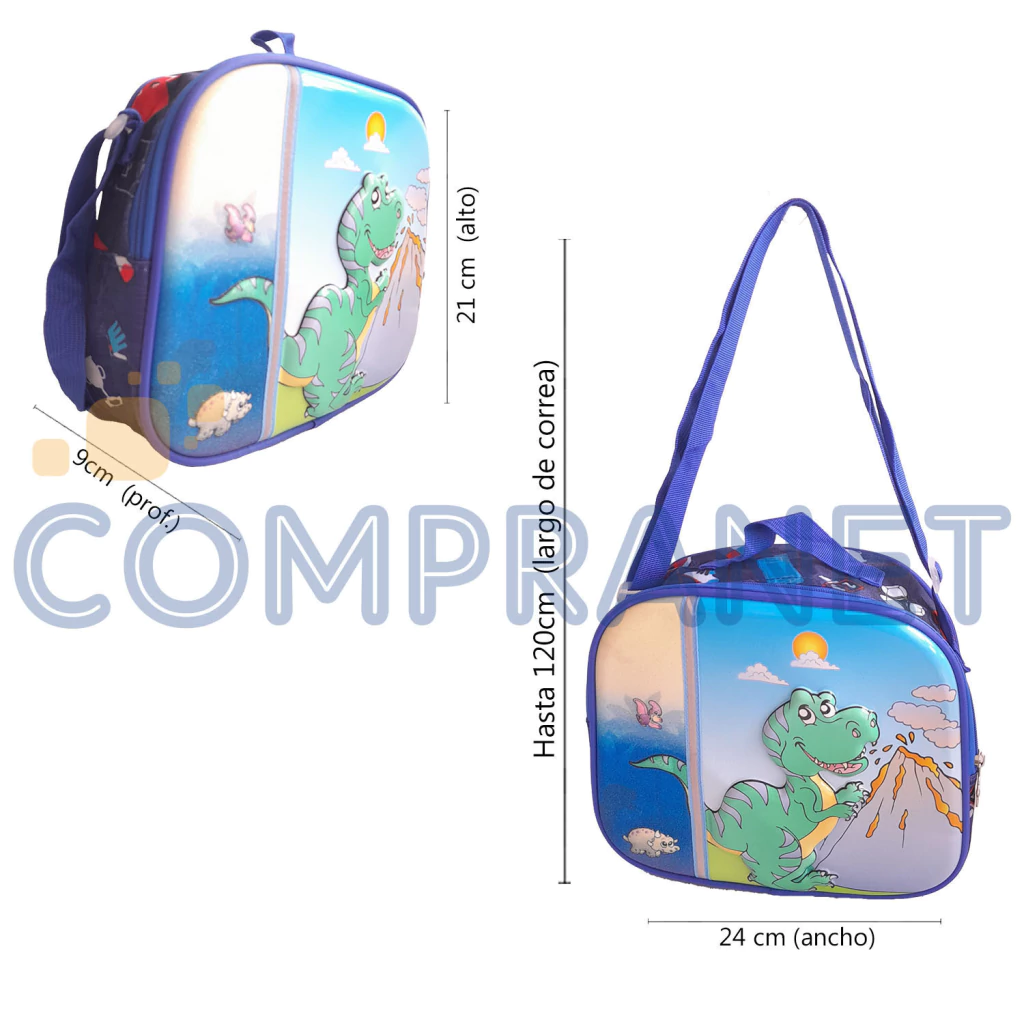 Kit Mochila de 16 pulgadas + Cartuchera + Lunchera, todo con el mismo diseño haciendo juego. Incluye carrito desmontable: la mochila se puede usar con o sin carrito.La mochila posee 2 compartimentos centrales espaciosos, con cierre metálico y deslizadores de metal decorativos. Más 1 bolsillo frontal rígido 3D, con cierre y deslizadores metálicos.Interior forrado en tela lisa con bolsillo interno.Con 2 bolsillos laterales, de red con ajuste elástico (ideal para la botella).Espalda acolchada, tiras traseras regulables y extensibles con hebillas plásticas.El Carro es extensible, ideal para uso diario. Con ruedas siliconadas.La lunchera posee frente rígido 3D, con interior térmico, y correa para llevarla al hombro tipo bolso. Posee solo 1 compartimento con cierre y deslizador metálico.Incluye cartuchera tipo tubo, con cierre y deslizador metálico. Con frente rígido estampado 3D.Modelos Disponibles:Modelo 1 AutoModelo 2 DinosaurioMaterial: Poliéster.Medidas Mochila: 30 cm (ancho) x 40 cm (alto) x 12 cm (prof.).Medidas Lunchera: 24 cm (ancho) x 21 cm (alto) x 8 cm (prof.).Medidas de Cartuchera: 23 cm (largo) x 10cm (ancho) x 6 cm (alto).Medidas del Carrito Extendido: 90 cm