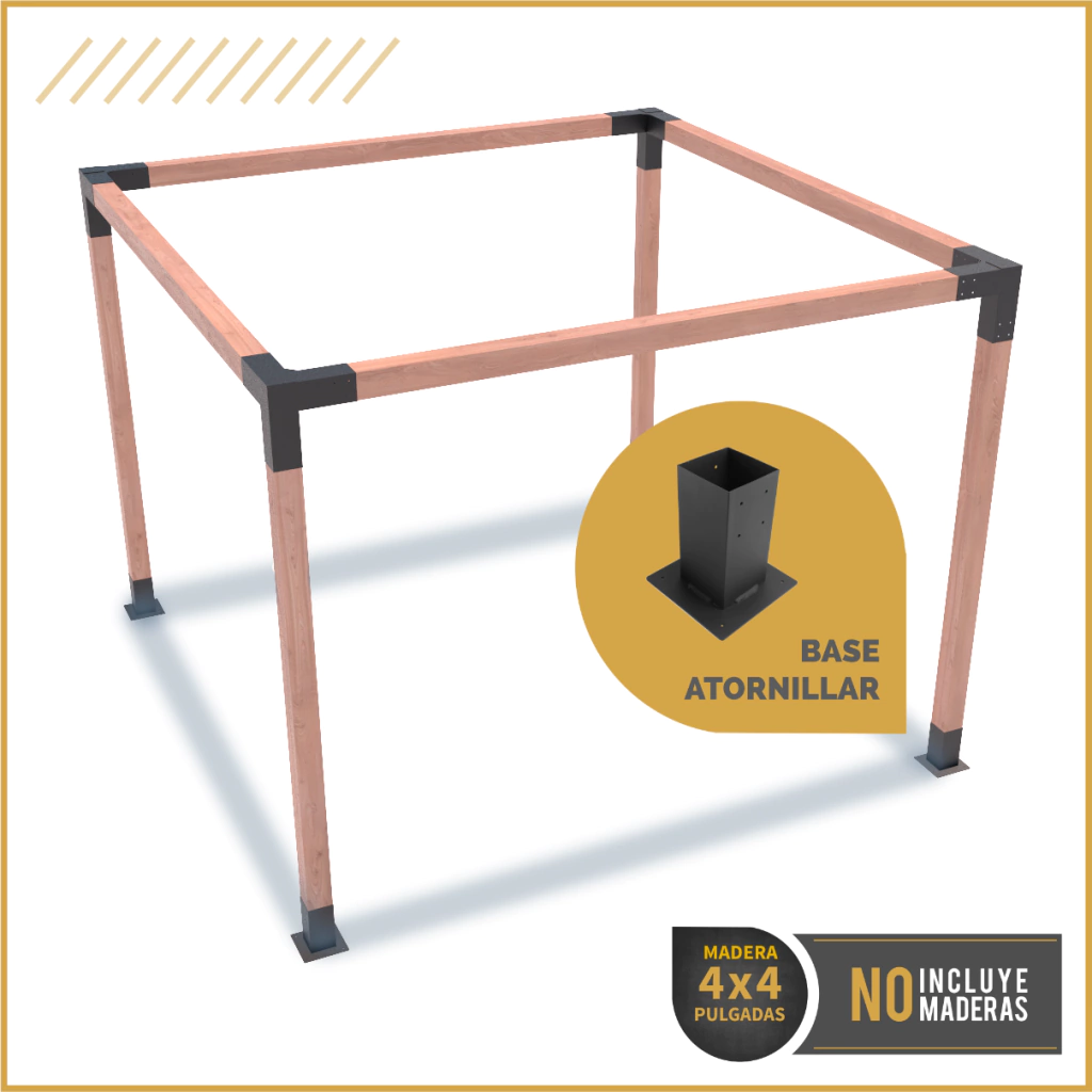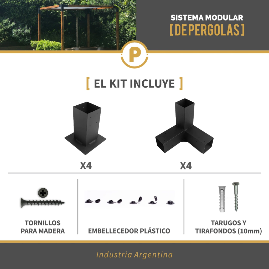 Construi tu porpia Pergola! 1 Modulo - Sobre Suelo - No incluye maderas!CCon este Kit de uniones metálicas vas a poder armar una pérgola con mínimos conocimientos y herramientas. Combinando los mismos con maderas de diferentes largos podrás construir una estructura que se adapte a tus necesidades y así lograr un nuevo espacio en tu hogar de manera rápida, simple y económica. Este kit esta pensado para maderas de 3x3 pulgadas (75x75mm). Te recomendamos entrar a esta publicación desde una computadora así poder ver en la ultima foto un video donde explicamos el uso del sistema. Los módulos son combinables entre si y esto hace que no tengas limites.Los soportes vienen para 2 medidas de madera: (Tenes las opciones al momento de comprar)3x3 Pulgadas (75x75mm)4x4 Pulgadas (95x95mm)Y podes elegir entre 2 tipos de bases para el suelo: (Tenes las opciones al momento de comprar)Base para Atornillar (Se adapta a suelos firmes y lisos, ideal para terrazas)Base para Cementar (Aptas para cualquier tipo de suelo, hay que realizar perforacion de 30cm y llenar con cemento)El kit incluye:- 4 Bases- 4 Codos a 90°- Tornillos y tapas plásticas para los mismos- 25 Tarugos y tirafondos de 10mm--------------------------------------------PECOLENos especializamos en fijaciones metálicas para tu proyecto. Estamos en Ing. Pablo Nogues (Zona Norte) Un equipo atento a tus consultas. Somos Pecole!-------------------------------------------ENVIOSEl kit entra en una caja de 60x40x30cm y pesa 23kg aprox• Capital Federal y Gran Buenos Aires envíos en 24/48hs (Lunes a Viernes)• Resto del país (Hasta 9 días hábiles)• Retira en nuestro deposito-------------------------------------------FORMAS DE PAGO• Hacemos Factura A• MercadopagoEsperamos su compra!