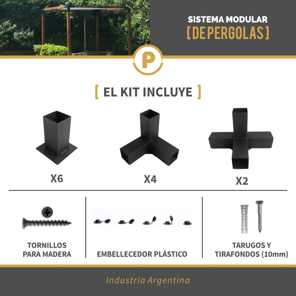 Construi tu porpia Pergola! 2 Modulo - Sobre Suelo - No incluye maderasCon este Kit de soportes metálicos vas a poder armar una pérgola con mínimos conocimientos y herramientas. Combinando los mismos con maderas de diferentes largos, podrás construir una pergola que se adapte a tus necesidades y así lograr un nuevo espacio en tu hogar de manera rápida, simple y económica. Los módulos son combinables entre si y esto hace que no tengas limites.Los soportes vienen para 2 medidas de madera: (Tenes las opciones al momento de comprar)3x3 Pulgadas (75x75mm)4x4 Pulgadas (95x95mm)Y podes elegir entre 2 tipos de bases para el suelo: (Tenes las opciones al momento de comprar)Base para Atornillar (Se adapta a suelos firmes y lisos, ideal para terrazas)Base para Cementar (Aptas para cualquier tipo de suelo, hay que realizar perforacion de 30cm y llenar con cemento)El kit incluye:- 6 Bases- 4 Codos a 90°- 2 Te Combinable- Tornillos y tapas plásticas para los mismos- 25 Tarugos y tirafondos de 10mm--------------------------------------------PECOLENos especializamos en fijaciones metálicas para tu proyecto. Estamos en Ing. Pablo Nogues (Zona Norte) Un equipo atento a tus consultas. Somos Pecole!-------------------------------------------ENVIOSEl kit entra en una caja de 60x40x30cm y pesa 23kg aprox• Capital Federal y Gran Buenos Aires envíos en 24/48hs (Lunes a Viernes)• Resto del país (Hasta 9 días hábiles)• Retira en nuestro deposito-------------------------------------------FORMAS DE PAGO• Hacemos Factura A• MercadopagoEsperamos su compra!
