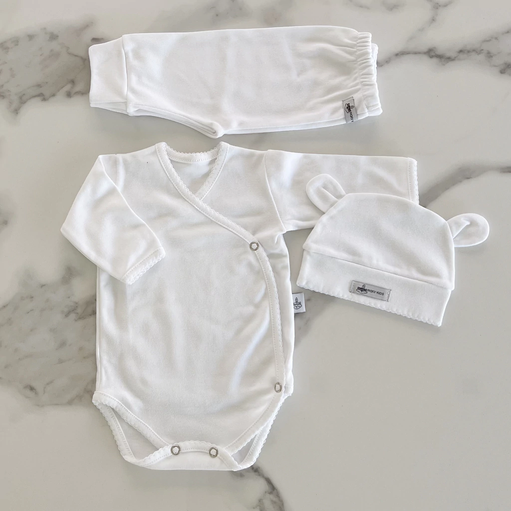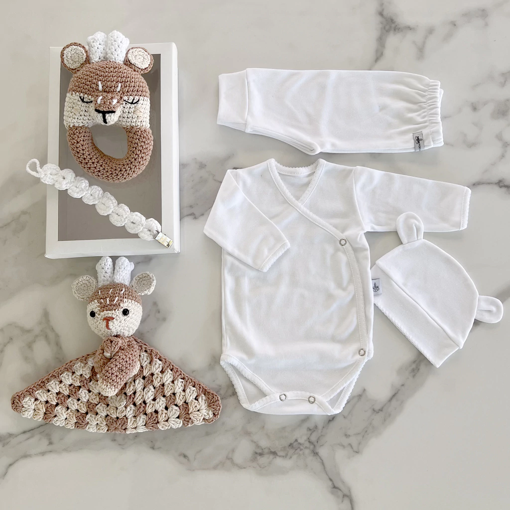 Incluye: Ajuar Completo de Body cruzado, Pantaloncito, Gorrito + Sonajero + Trapito de Apego + Portachupete + Caja de Regalo.