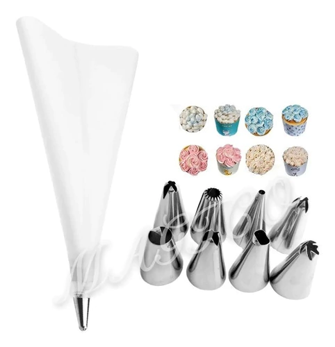 El kit Reposteria incluye 8 Picos 1 Acople 1 Manga (se envia en color celeste o blanca) 2 pinceles para basting (uno grande y uno chico) 1 espátula escalonada de acero inxidable 1 pincel de silicona 1 espatula de silicona Se envia en color surtido dependiendo stock.
