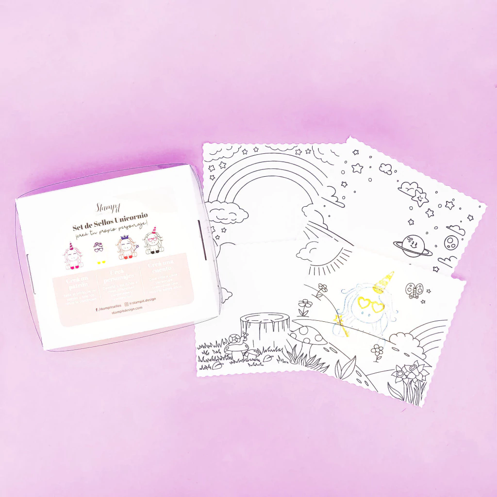 kit de 7 sellos, 6 sellos de 3x3 y 1 de 5x5. Tambien incluye almohadilla entintada y 4 papeles con distintos diseños.