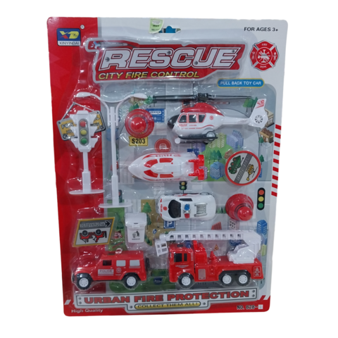 SET DE RESCATE INCLUYE 5 MEDIOS DE TRASPORTE MAS ACCESORIOS PARA JUGARMATERIAL PLASTICOMEDIDAS APROXIMADASCAMION BOMBERO 16 CMAUTO POLICIA BLANCO 9 CMCHATA DE POLICIA BOMBERO 11 CMLANCHA 11 CMHELICOPTERO 16 CM