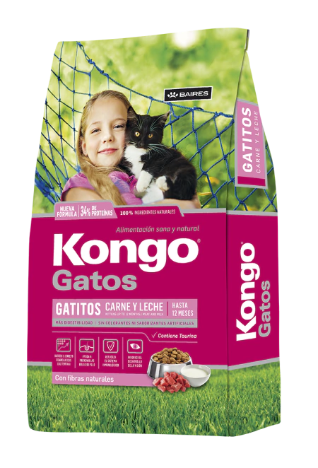 Kongo Gatitos sabor Carne y LecheIngredientes:Harina de carne vacuna, harina de pollo, trigo, maíz, gluten de maíz, germen de maíz, arveja, harina de soja, levadura de cerveza, aceite de pollo, carbonato de calcio, sal yodada, cloruro de potasio, pulpa de remolacha (fuente de fructo-oligosacáridos), zeolita, leche en polvo, extracto de yucca schidigera, espinaca deshidratada, hidrolizado proteico de pollo, ácido cítrico, tocoferoles, dipropionato de amonio, ácido propiónico, núcleo vitamínico-mineral: vitaminas A, D3, E, K, B1, B2, B6, B12, ácido fólico, ácido nicotínico, ácido pantoténico, biotina, colina, minerales: zinc, hierro, cobre, yodo, manganeso, selenio.Contenido Nutricional:Alimentación Sugerida: