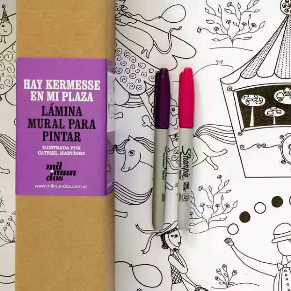 LÁMINA MURAL PARA PINTARLa kermesse:: ilustrada por Catriel Martínez[Para pintar y colgar en la pared]Impresa en tinta negra sobre papel obra de 120 gLámina desplegada 41 x 118 cm.Se presenta en una bonita caja regalo de 7 x 7 x 42 cmInvita a la actividad compartida y regala muchas horas de juego.Extra grande y con línea de horizonte. Para colorear y después enmarcar.Especial para pintar en familia, permite de dos a cuatro participantes simultáneosMarcadores no incluidos.