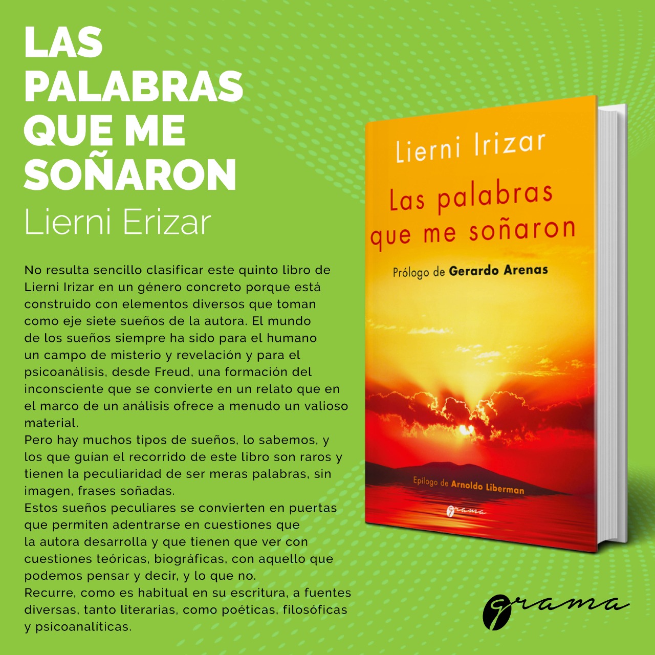 No resulta sencillo clasificar este quinto libro de Lierni Irizar en un género concreto porque está construido con elementos diversos que toman como eje siete sueños de la autora. El mundo de los sueños siempre ha sido para el humano un campo de misterio y revelación y para el psicoanálisis, desde Freud, una formación del inconsciente que se convierte en un relato que en el marco de un análisis ofrece a menudo un valioso material.