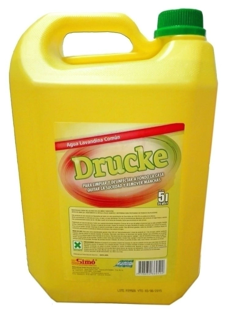 Agua Lavandina 55 g Cl/lDRUCKECARACTERÍSTICAS Y BENEFICIOS:. Elimina el 99% de los Gérmenes como Staphylococcus Aureus, Pseudomona Aeruginosa y Salmonella Cholerasuis, entre otros.. Limpia y desinfecta a fondo.. Apta para Potabilizar Agua.. Quita la suciedad y remueve manchas.