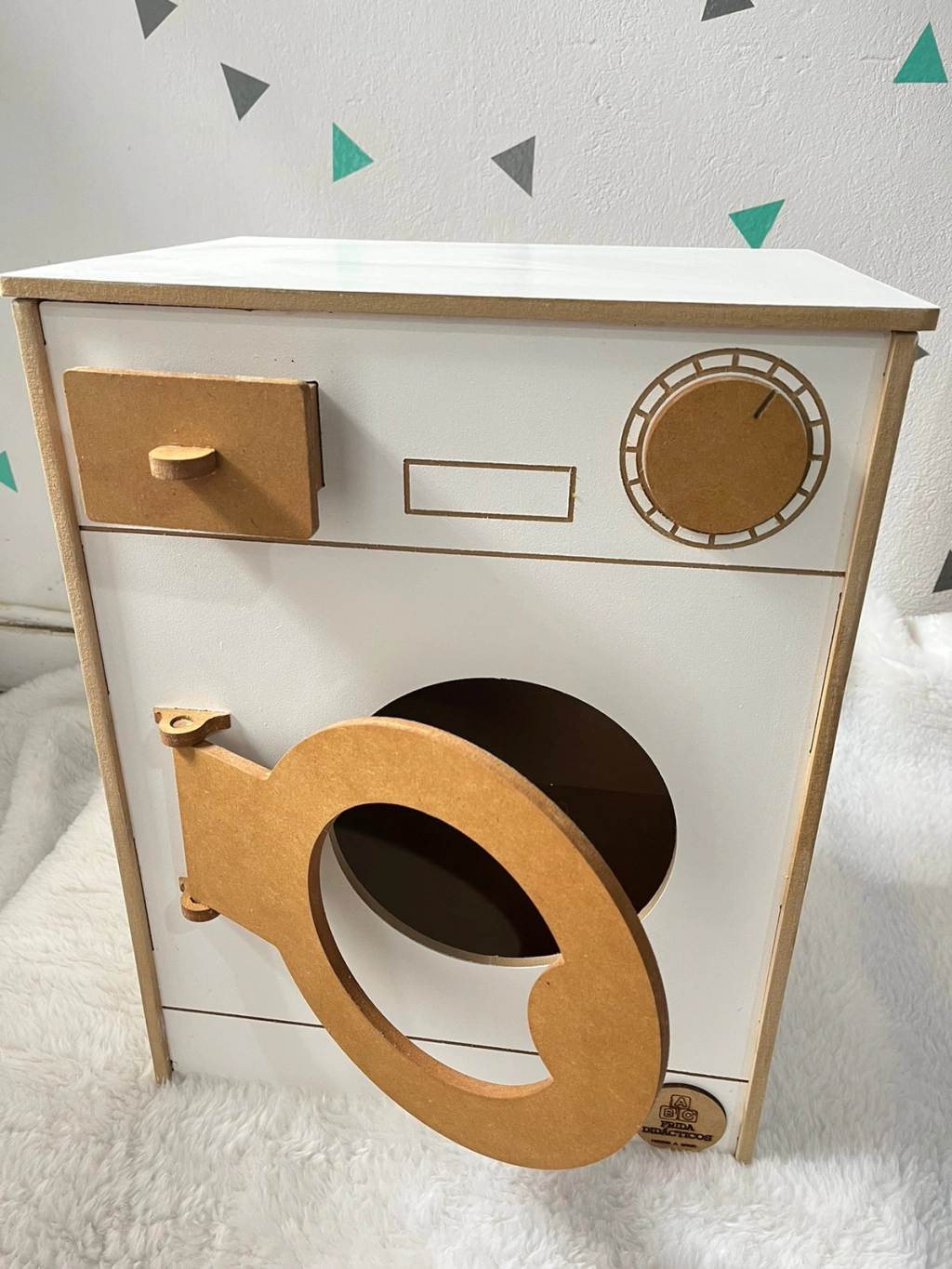Lavarropas montessori pintadoEl cajón y la puerta se abrenLa perilla giraMedidas :alto 53 cmancho 40cmprofundidad 32cm.MaterialMdf de 9mmPintado con esmalte al agua lavableSomos fridadidacticos