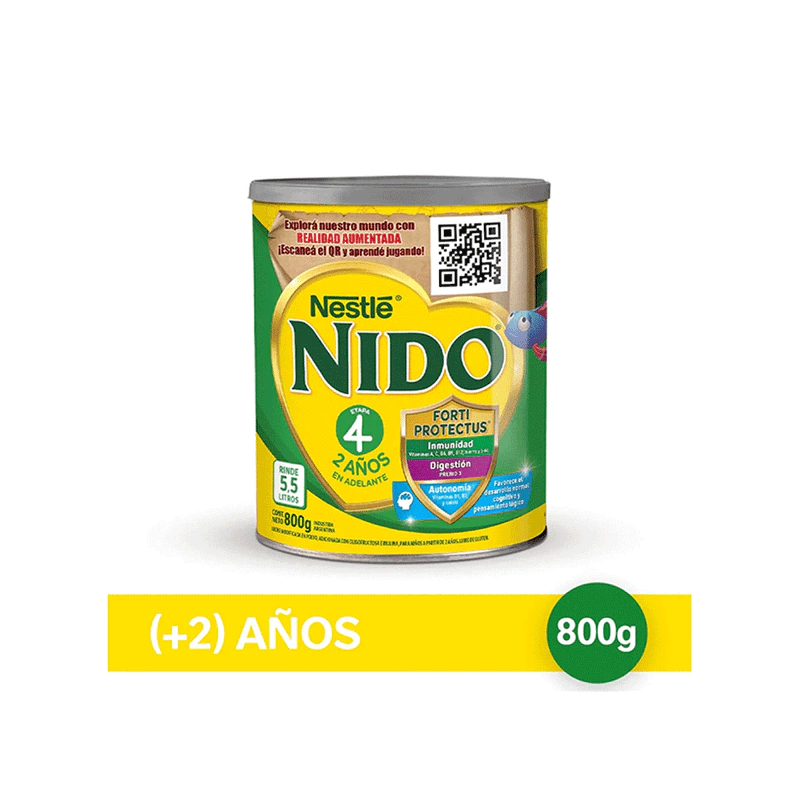 Unidad: Lata De 800 Gramos Leche Modificada A2 Beta-Caseína En Polvo Para Niños A Partir De 2 Años, Adicionada Con Oligofructosa E Inulina. Libre De Gluten. Sin T.A.C.C. Esta Leche Está Desarrollada Para Chicos Con Edad Escolar Con Los Nutirentes Esenciales Para Mantener Su Protección, Estimular Su Aprendizaje Y Promover Su Crecimiento. Preparación: Para Un Vaso (200cm3) Añadir 2 Cucharadas Soperas (29g) De Nido 4 A Un Vaso De 180cm3 De Agua Segura. Verter El Agua Y Luego Verter El Polvo, Revolver Hasta Que El Polvo Se Haya Disuelto. Conservación: Una Vez Abierto Consumir Dentro De Los 3 Meses. Cerrar Bien El Envase Luego De Usarlo Y Mantenerlo En Un Lugar Fresco Y Seco Sin Exposición A La Luz Solar. Manejar Con Utensilios Limpios Y Secos.