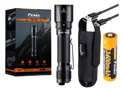 LINTERNA TACTICA FENIX TK11RLa linterna táctica LED Fenix TK11R USB es el compañero perfecto para tus aventuras al aire libre. Con un alcance de proyección de 420 metros, esta linterna te proporcionará una iluminación potente y clara en cualquier situación. Su diseño compacto y resistente al agua y al polvo la hace ideal para actividades como camping, caza y supervivencia. Además, cuenta con 4 modos de cambio de luz para adaptarse a tus necesidades. Con su función de carga USB, podrás recargarla fácilmente en cualquier lugar. No te quedes sin luz en tus expediciones, ¡adquiere la linterna táctica LED Fenix TK11R USB ahora mismo!SALIDAS:High: 1600 Lumens, 1.83 hours, 1378 feetMed: 350 Lumens, 4.17 hours, 656 feetLow: 30 Lumens, 25.5 hours, 197 feetStrobe: 1600 LumensDETALLES:420-meter beam distanceDual tail switchTrue-instant strobe from offBuilt-in USB-C charging port with battery level indicatorCompact size; tactical functionSmaller and lighter than a typical smartphoneInner waterproofing to IP68 standard. Waterproof to at least 2 meters for 30 minutes, even with the dust cover open.25.5 hour runtimePatented APF technologyIntelligent overheat protectionImpact resistant to 1 meter dropBATERIAS:Included: Fenix ARB-L18-3400 Rechargeable 3400mAh 18650 BatteryCompatible: One 18650 battery (ARB-L18- Series) or two non-rechargeable CR123A batteries.TAMAÑO:Length: 5.73 inchesHead Diameter: 1.34 inchesBody Diameter: 0.93 inchesWeight: 4.14 ounces