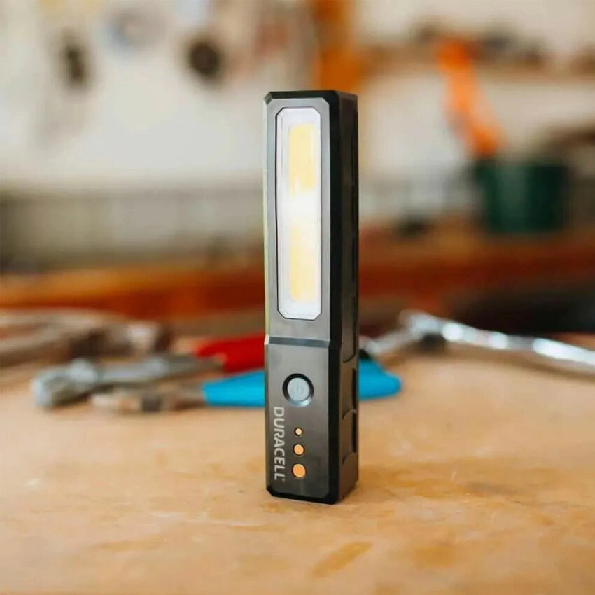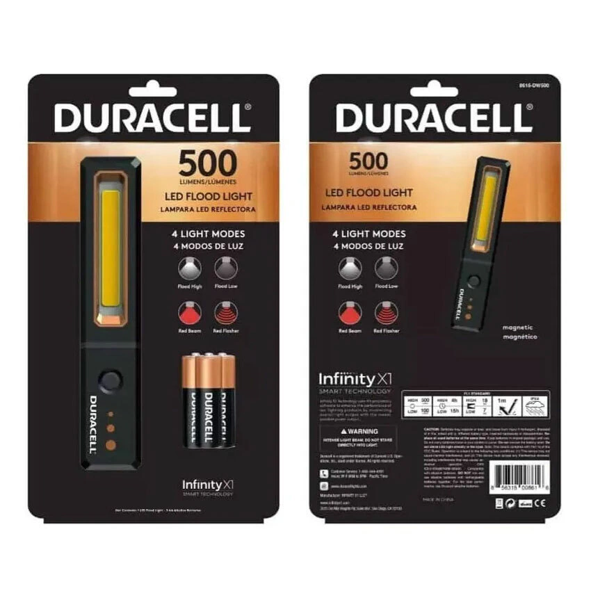 Lampara LED reflectora 3AA 500 lúmenes Duracell 8616-DW500• InfinityX1 Smart Technology.• 3 pilas AA incluidas.• 4 modos de luz:- Alta: 500 lúmenes / 4 horas de duración / 18 metros de distancia del haz.- Baja: 100 lúmenes / 15 horas de duración / 7 metros de distancia del haz.- Luz roja.- Luz intermitente roja.• Resistencia al impacto: 1 metro.• Resistencia al agua: IPX4.• Base magnética.• Material: Acero.• Código: 8616-DW500.